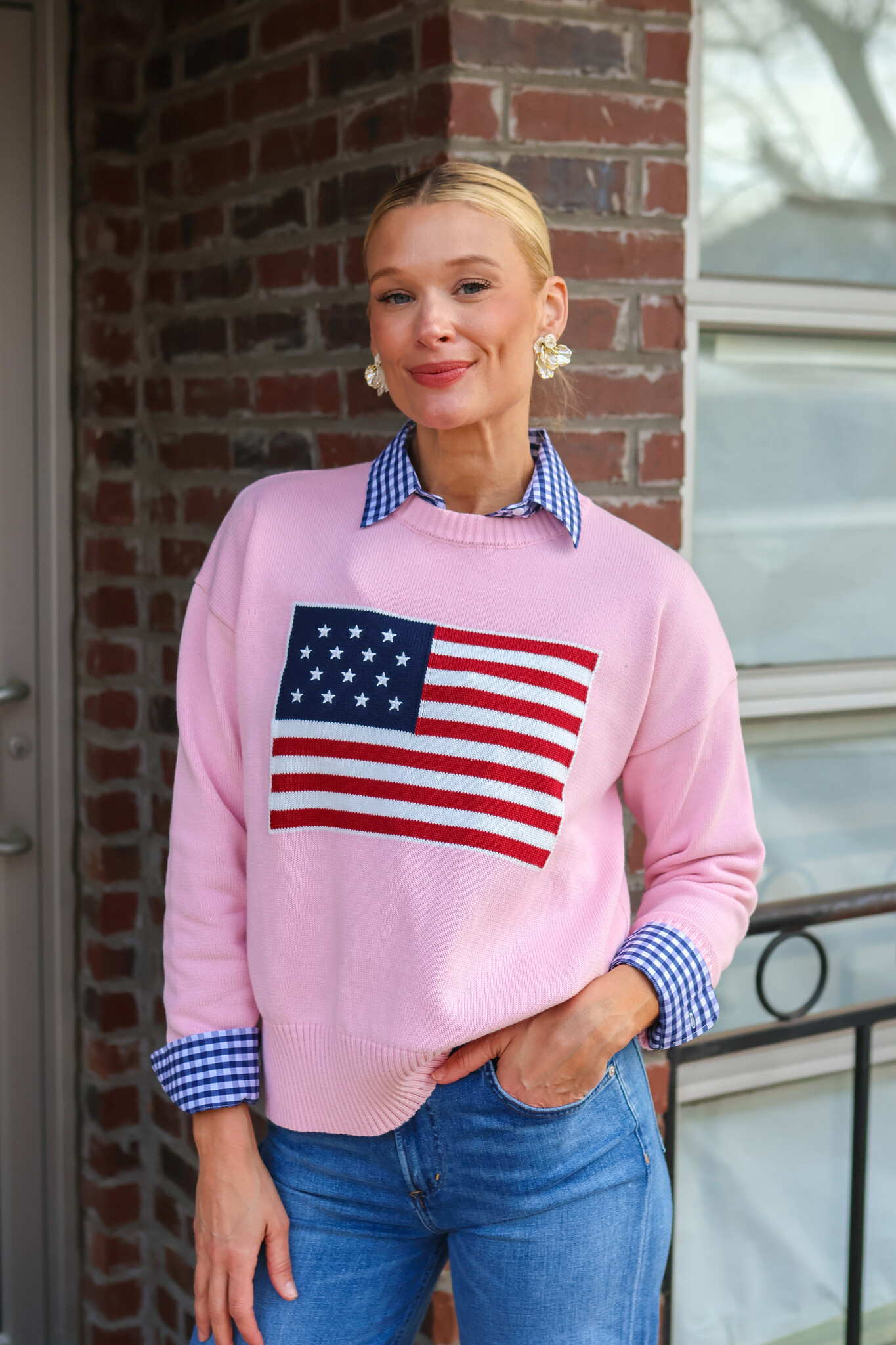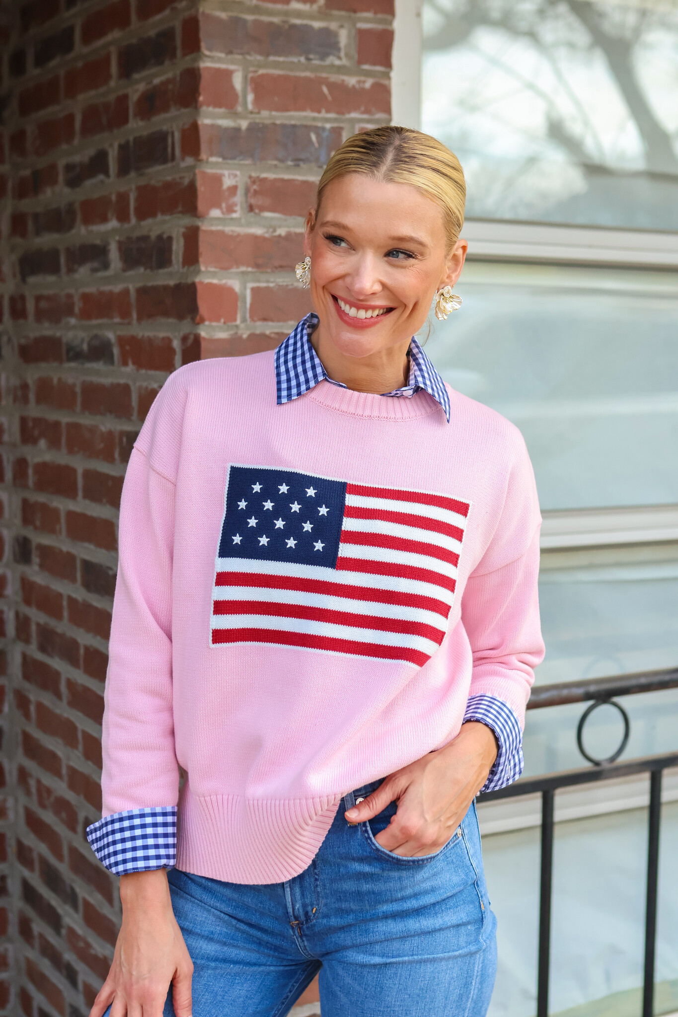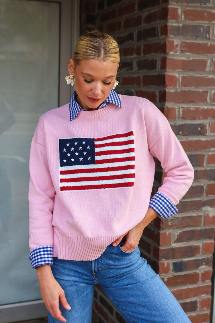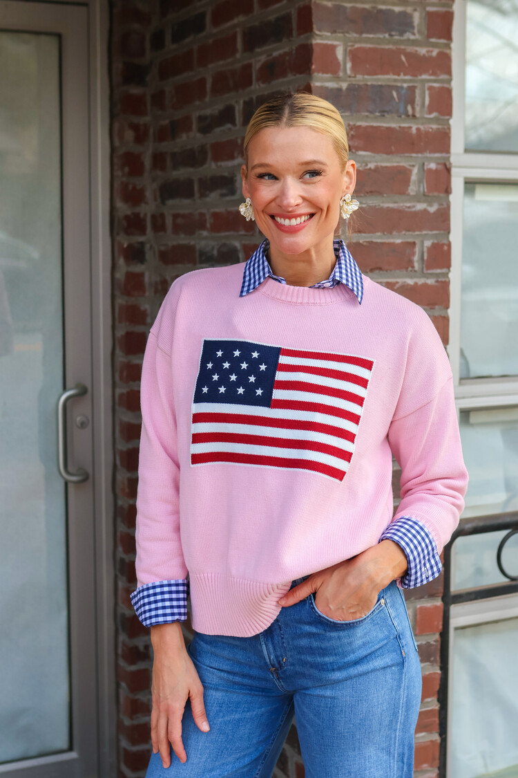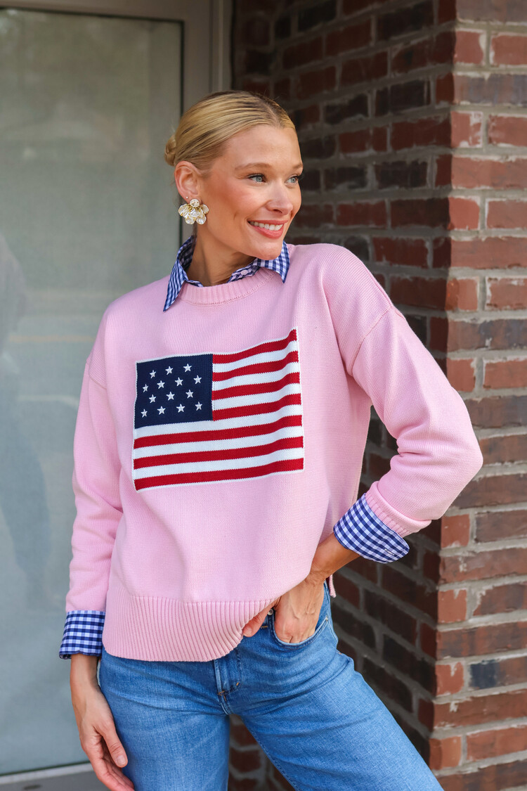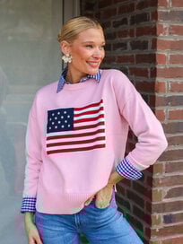 A soft knit sweater featuring a classic American flag motif at the front. Designed with a relaxed silhouette, crew neckline, and long sleeves for effortless comfort. Finished with ribbed trim at the neckline, cuffs, and hem for a clean, polished look.