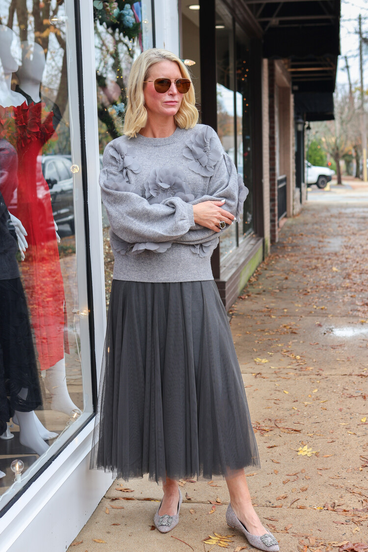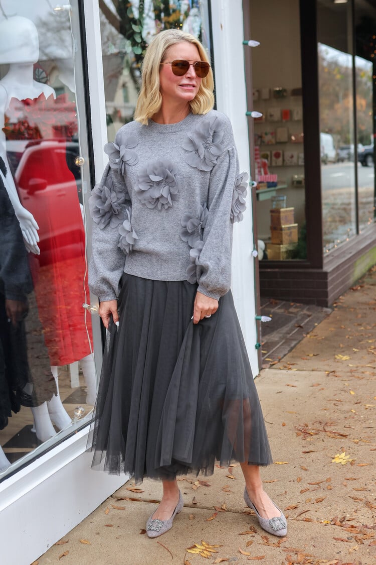 • 100% Merino Wool Round Neck Sweater with 3-D Floral Appliqué
