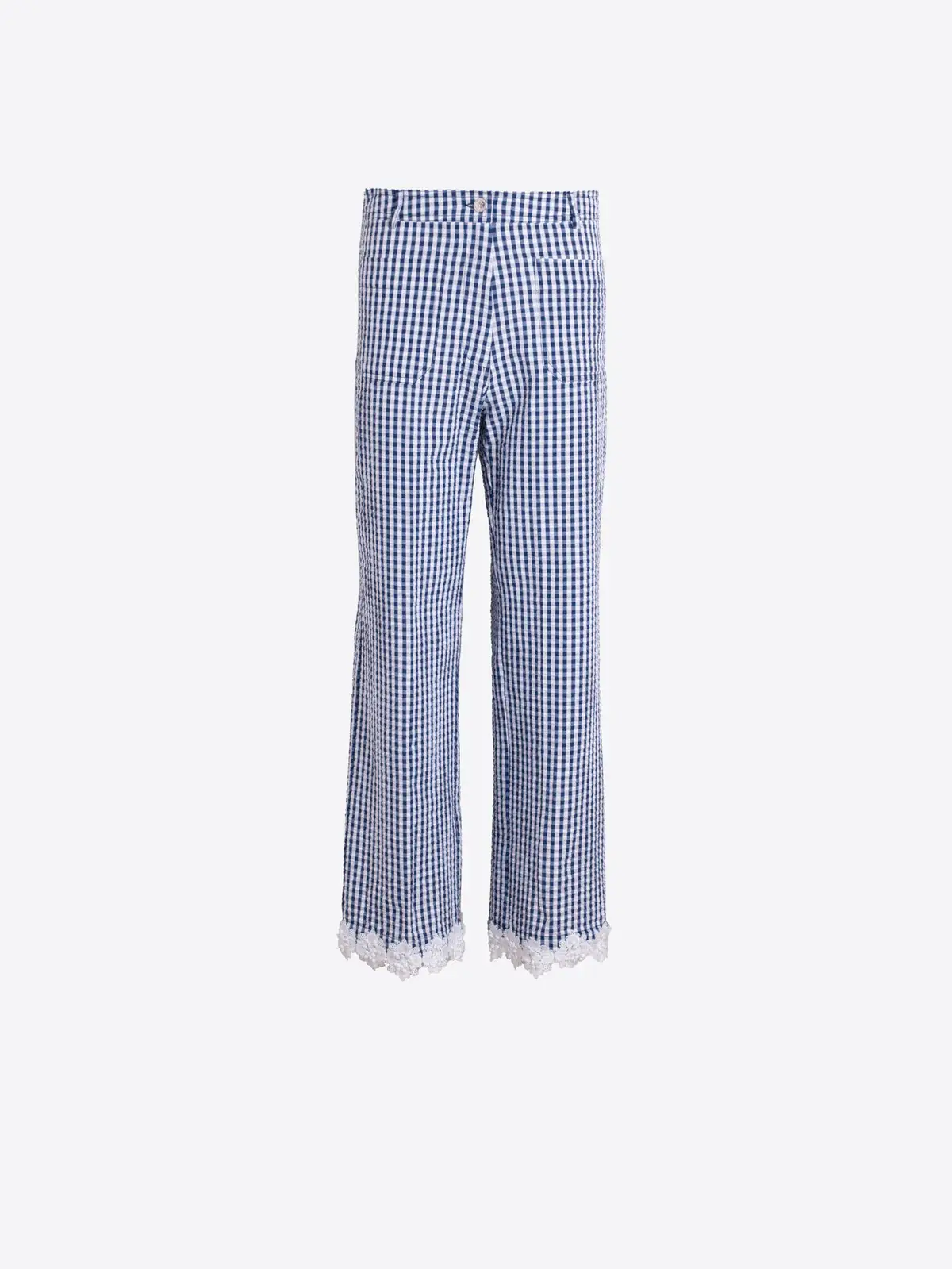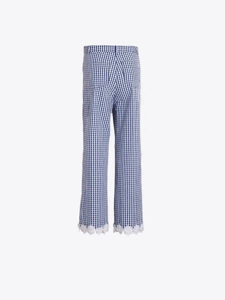 • Women's pants with a navy and white gingham print. The hem is finished with white lace. 100% COTTON