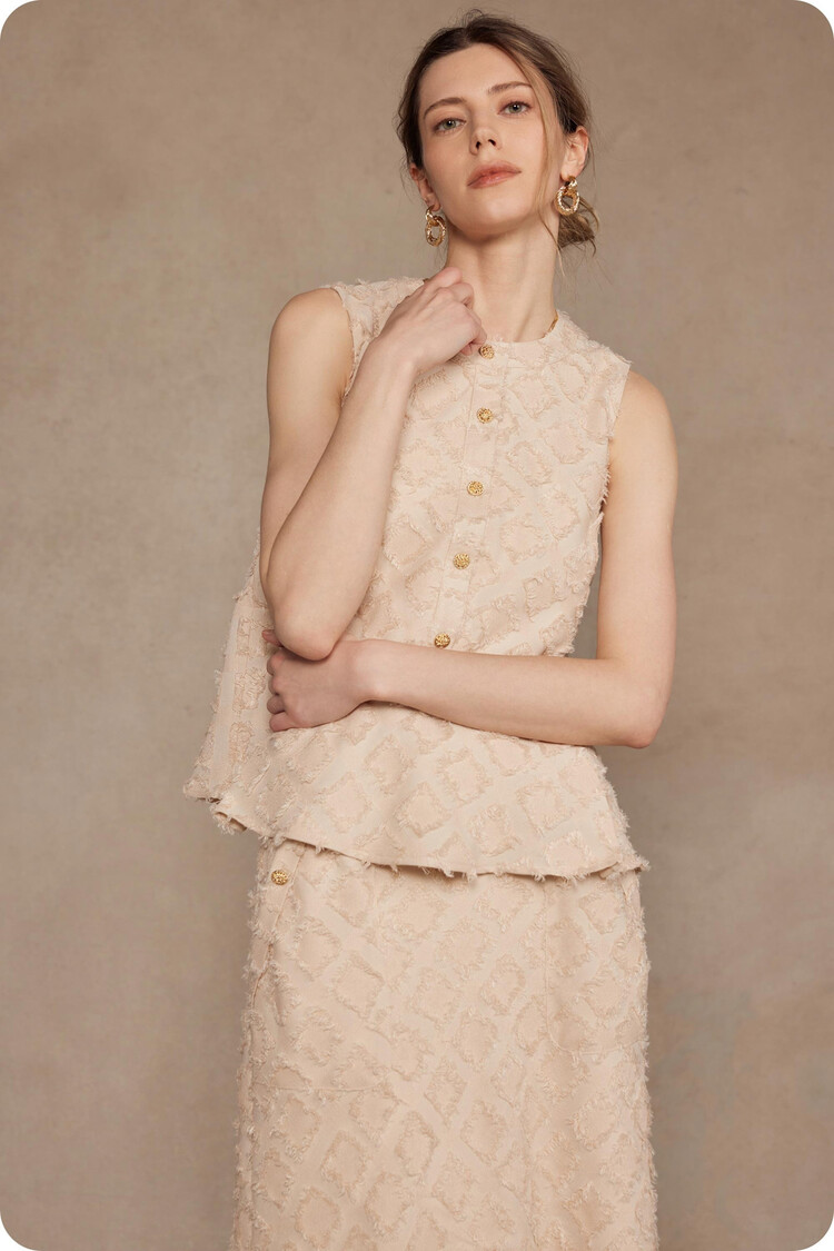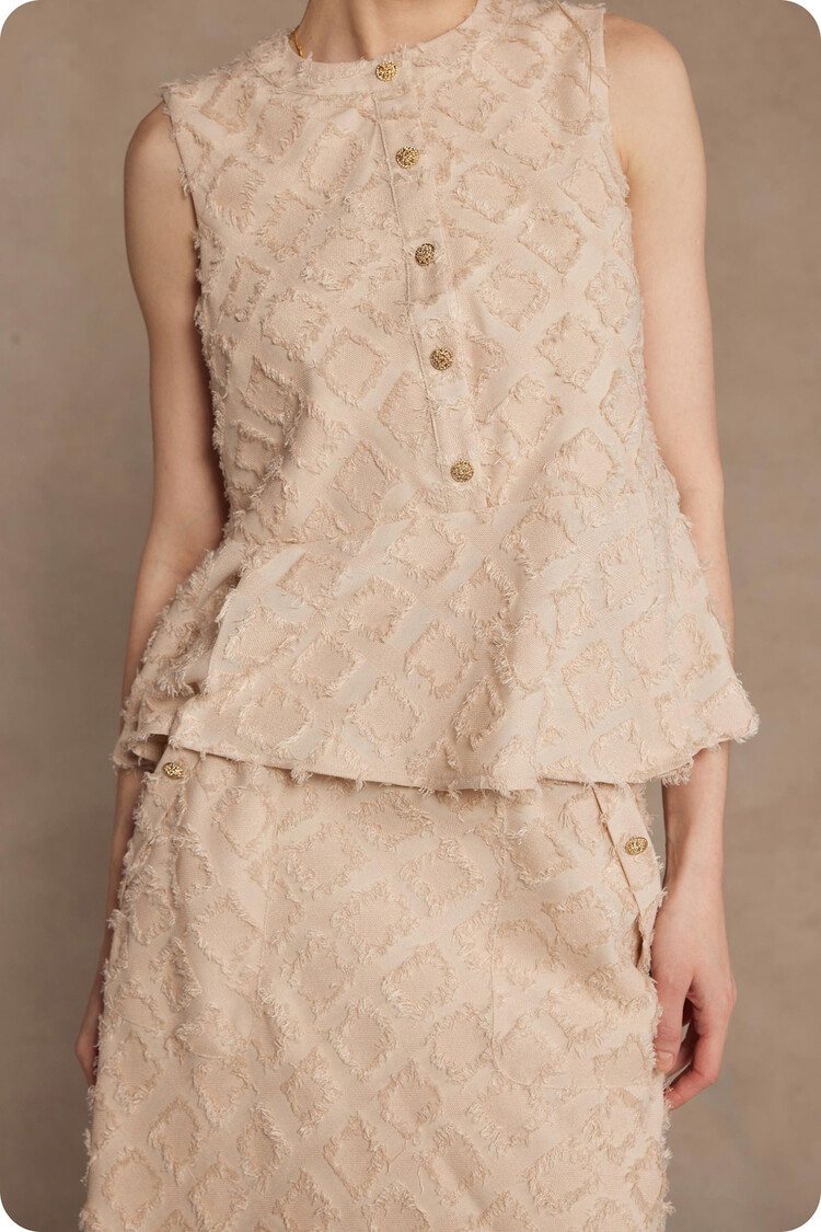 • Puff short sleeve top in textured fray plaid fabric. This sleeveless blouse features a classic 4 gold button closure at neckline, puff short sleeves, lining, round neckline, and a peplum hem.