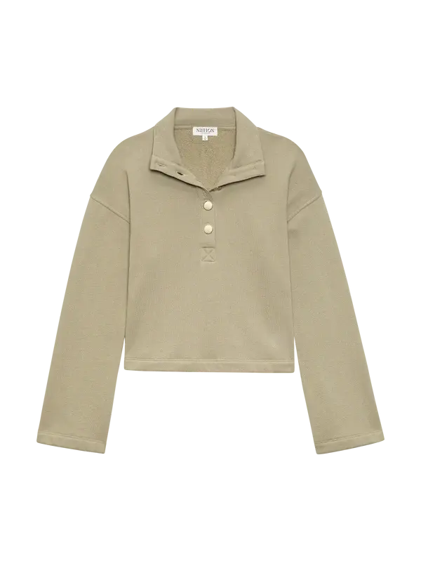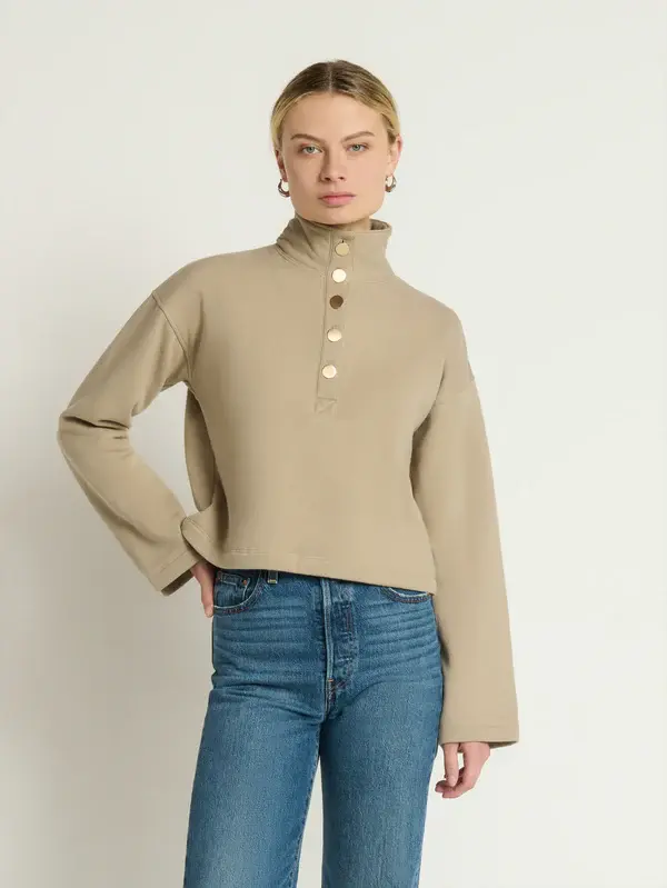 Fleece, but make it chic. This 100% cotton collared sweatshirt has a slightly cropped, boxy fit, dramatic bell sleeves, and gold-tone buttons. Dress it up or down depending on your mood.