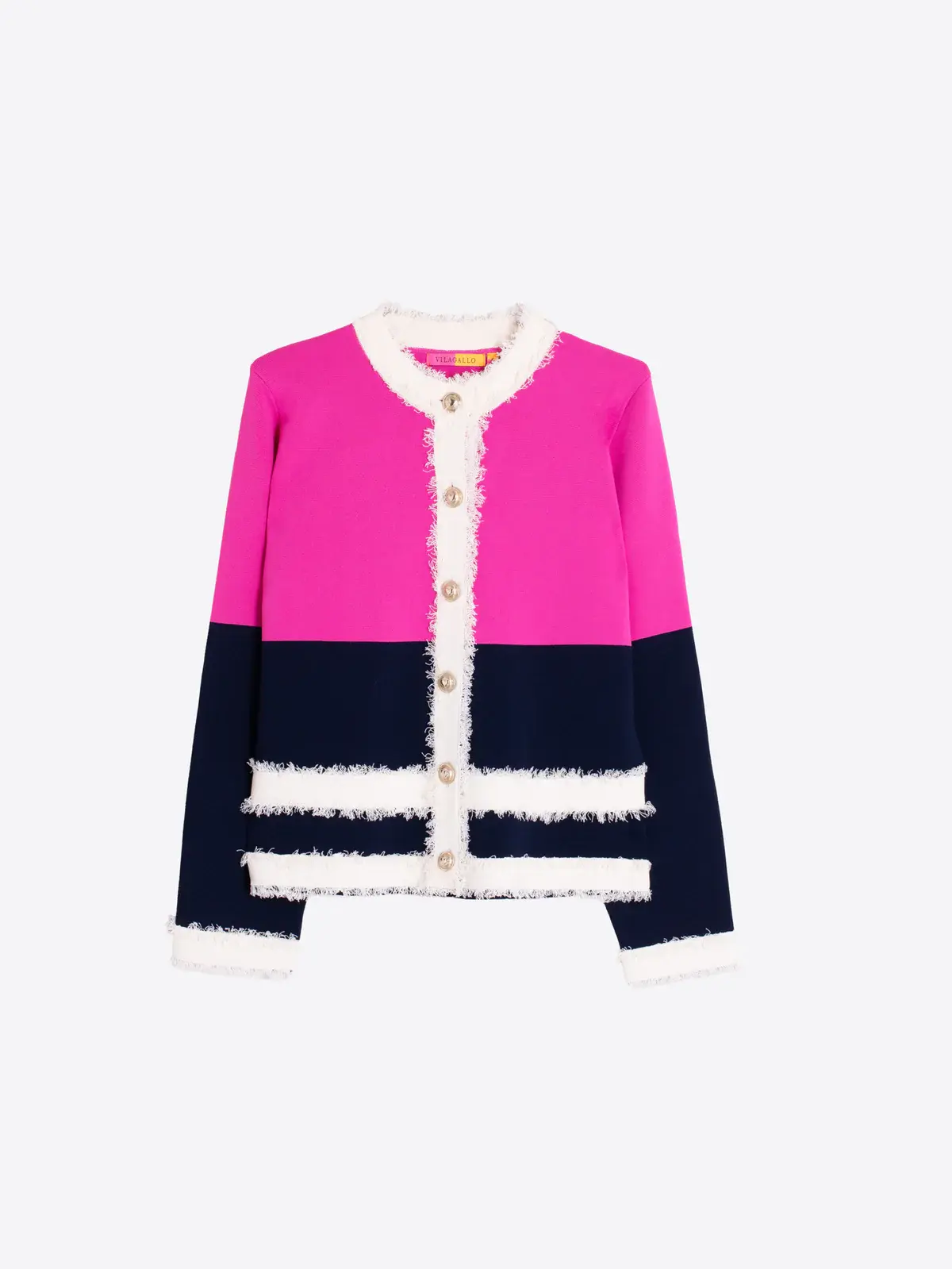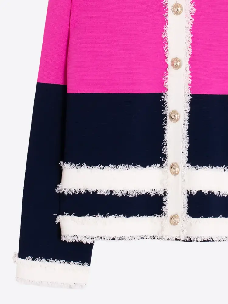• Two-tone knit cardigan in fuchsia and navy with contrasting ecru frayed trim. Features a round neck, front button closure with visible metal buttons, and two decorative faux pockets at the bottom. Ribbed cuffs and hem. Straight silhouette.