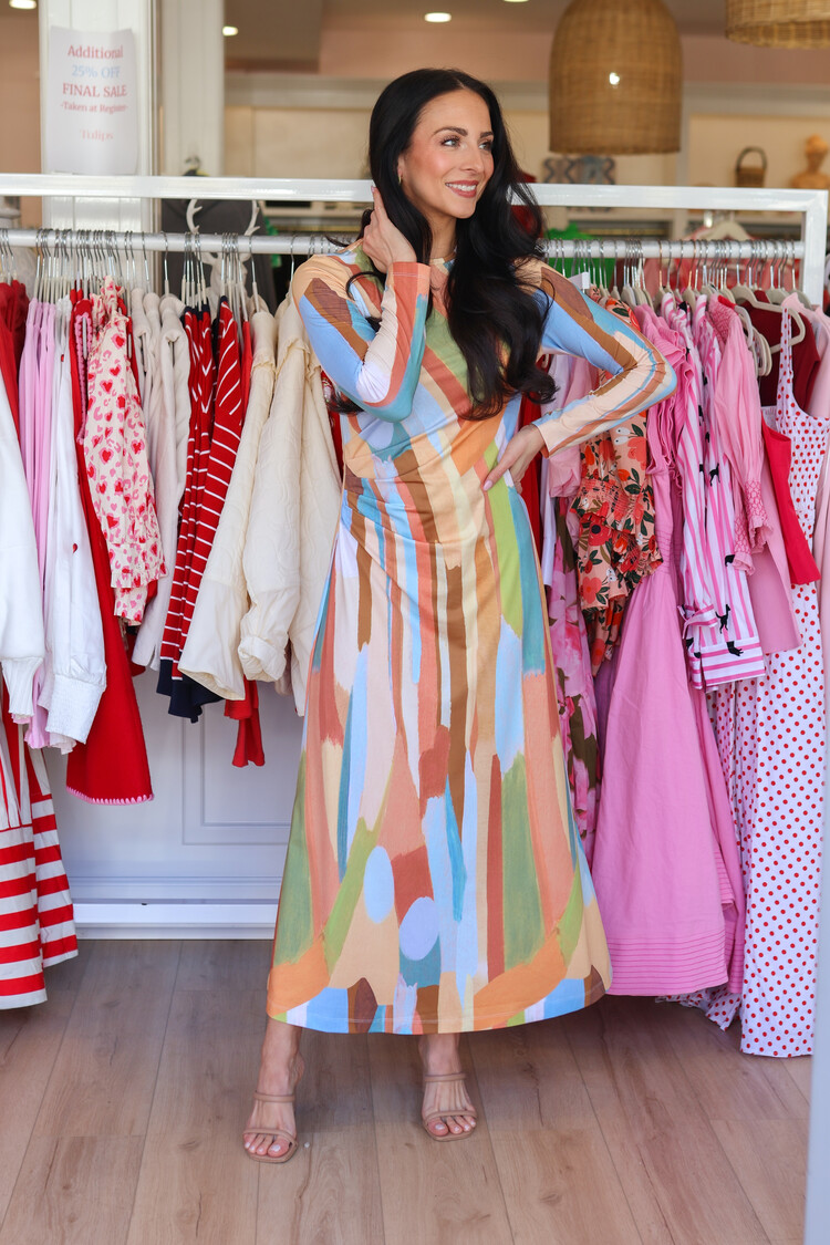 • The Gabriella Midi Dress in Fresco Tides is an effortless daytime staple designed in soft, stretch jersey for a flattering fit. Side-seam ruching adds subtle shaping, while full-length sleeves offer a polished finish perfect for everyday sophistication.