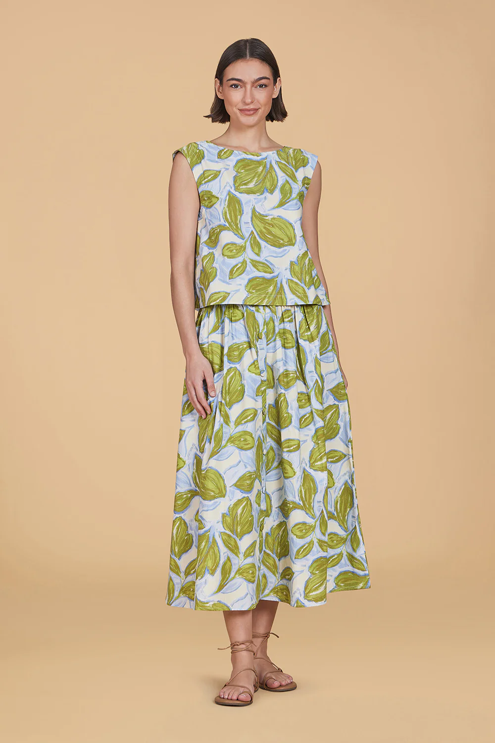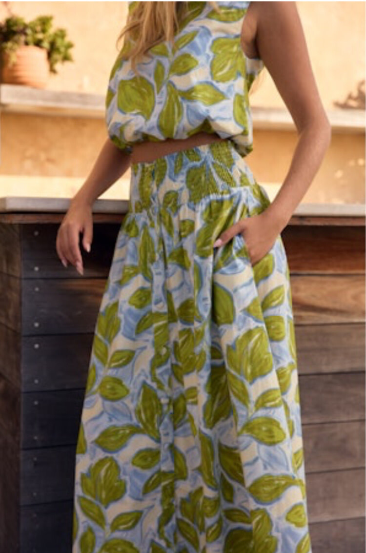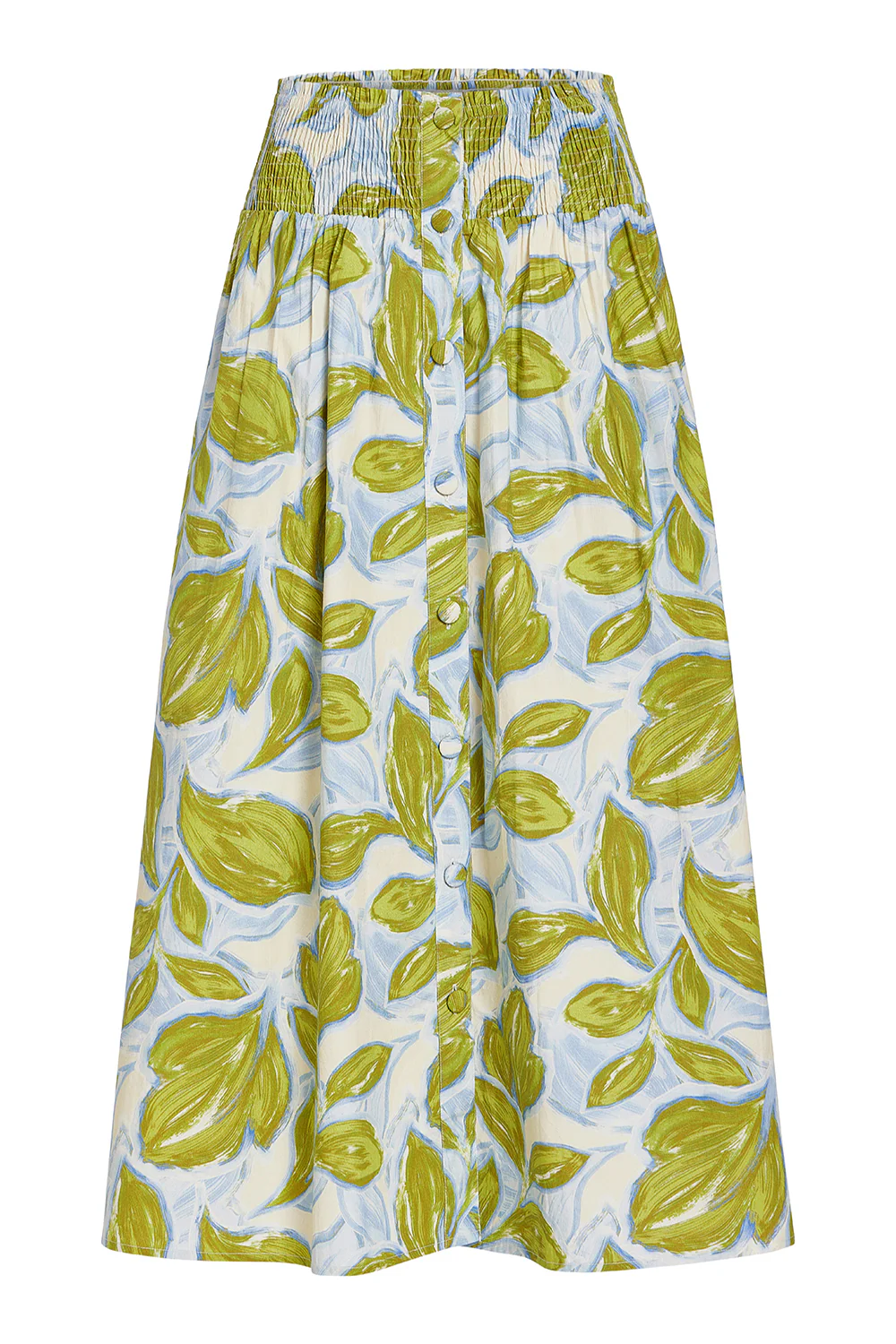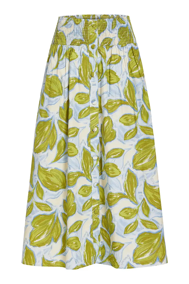 • The Georgia Skirt offers a timeless, feminine look with its breezy A-line shape, comfortable smocked waistband, and scalloped hem. Covered buttons trail down the front for a polished finish, while the Zest Leaves pattern adds texture and charm.