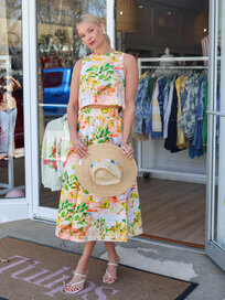 A printed two piece set featuring a sleeveless crop top with a square neckline, hidden side zipper and wide shoulder straps. Paired with a matching high-waisted midi skirt designed with a flattering A-line silhouette. Finished with a side zipper closure.