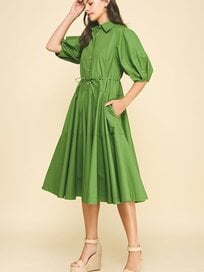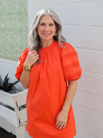 This versatile mini dress features intricate reverse pin-tuck detail at sleeve/neck, shirred shoulders, short puff sleeve with elasticated cuff, side pockets, lining, round neck with shirring detail at front, and keyhole with button closure at back.