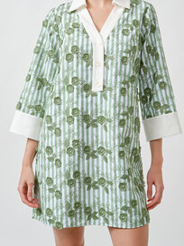 Ruffle scallop embroidery mini dress in an exclusive floral stripe print on stretch poplin fabric. This relaxed shift shirt mini dress features intricate contrast color scallop embroidery throughout, side pockets, ruffled flutter short sleeve, and lining.
