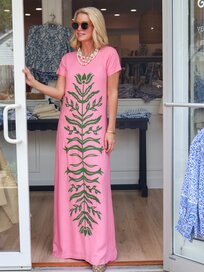 Its rich blue hues come alive with intricate tapestry-inspired embroidery, creating a garden motif that dances across the fabric. The neckline frames the face gently, while the long sleeves and flowing midi silhouette offer a graceful, comfortable fit.