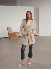 This belted hooded cardigan in oatmeal heather features a relaxed, open-front silhouette with wide sleeves and front patch pockets for effortless layering. The soft knit texture and self-tie waist add cozy structure to this casual yet polished piece.
