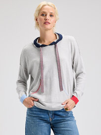 This lightweight knit features a relaxed silhouette with whimsical details like a colorful striped drawstring, contrast cuffs, and a roomy pocket. The rounded hemline adds a flattering shape, while the soft knit fabric keeps it comfy and breathable.