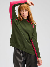 Green knit sweater with a round neckline and straight cut. Features balloon sleeves with ribbed texture on the upper section and fitted cuffs. The sleeves are decorated with horizontal stripes in navy blue and fuchsia. Structured wool-blend fabric.