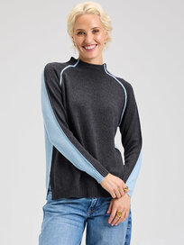 The Reversible Block Funnel Sweater offers two looks in one: one side in grey with blue accents, the other blue with grey highlights. With a soft, cotton-cashmere blend, long raglan sleeves, and a cozy funnel neckline, it delivers comfort and polish.