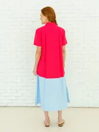 This 50-inch silhouette features a great popped collar and is adorned with a pop of color grosgrain ribbon along the inside placket for a subtle, playful detail. Flowy, flattering, and comfortable, it’s the kind of effortless dress you can throw on and go
