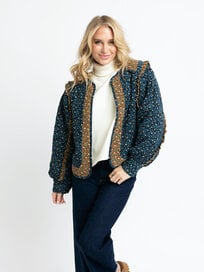The Lolli Sweater showcases a stand collar with a notched neckline & blouson sleeves finished with ribbed cuffs. Knit directly into the fabric, the embroidered Lone Star icons bring western-inspired flair, from boots and longhorns to and bluebonnets.