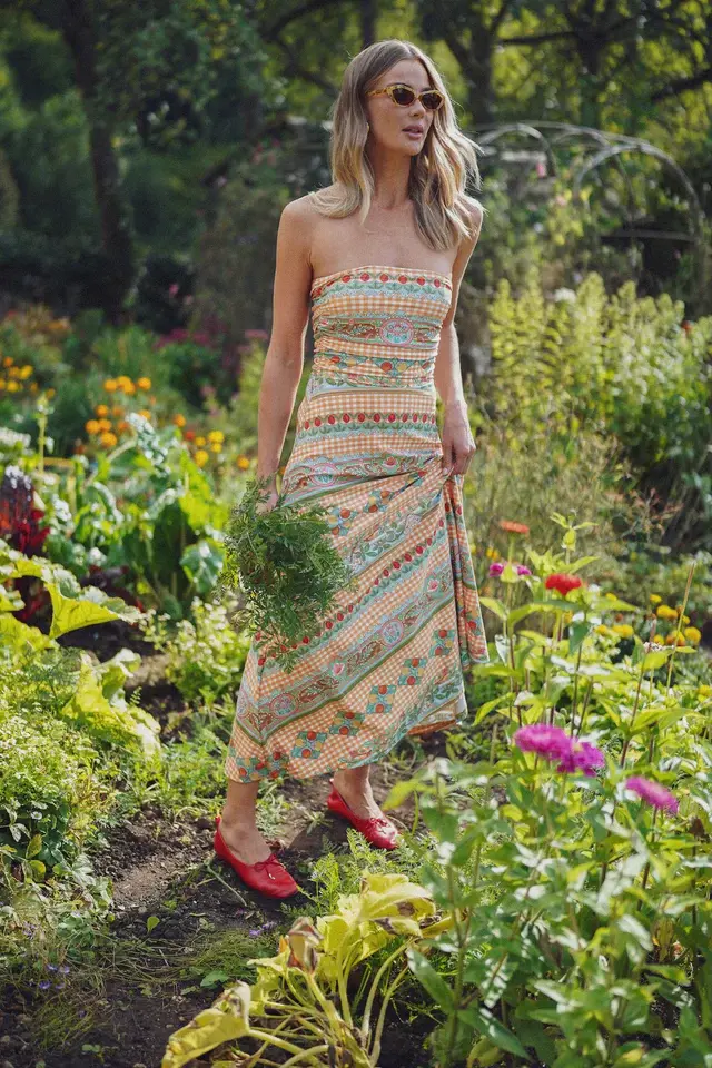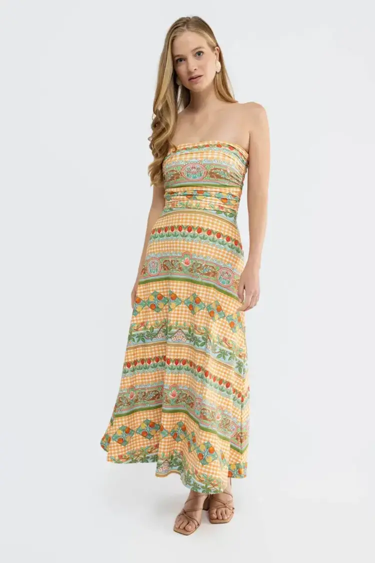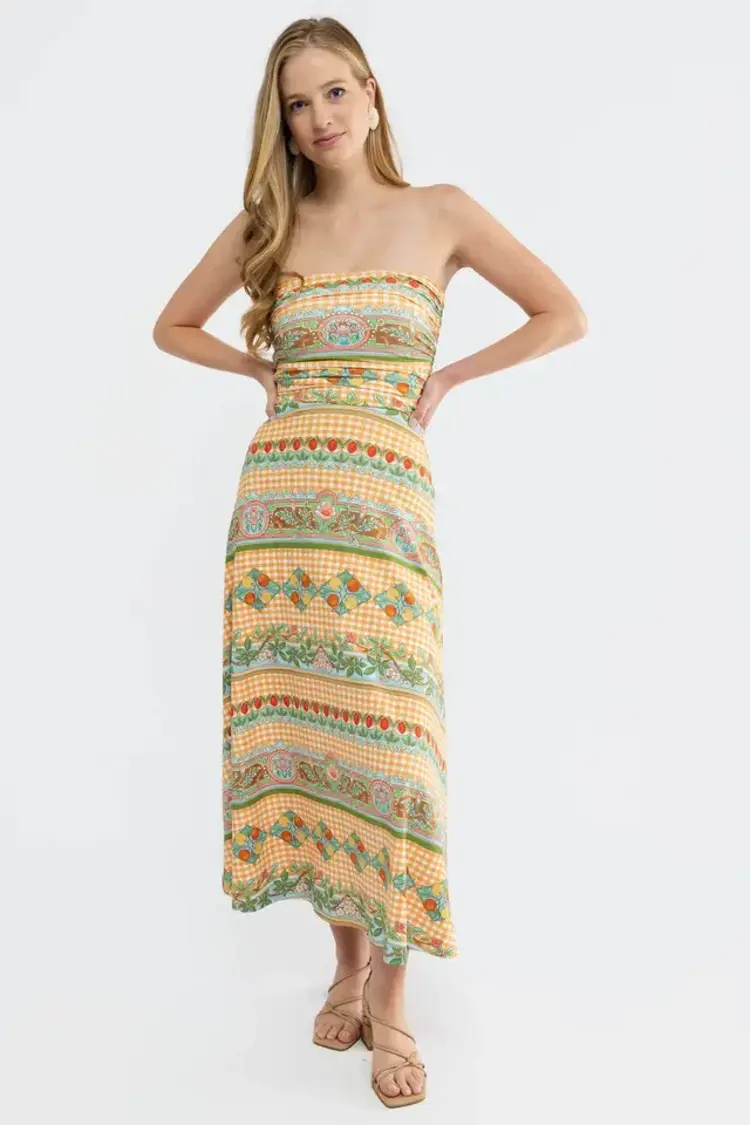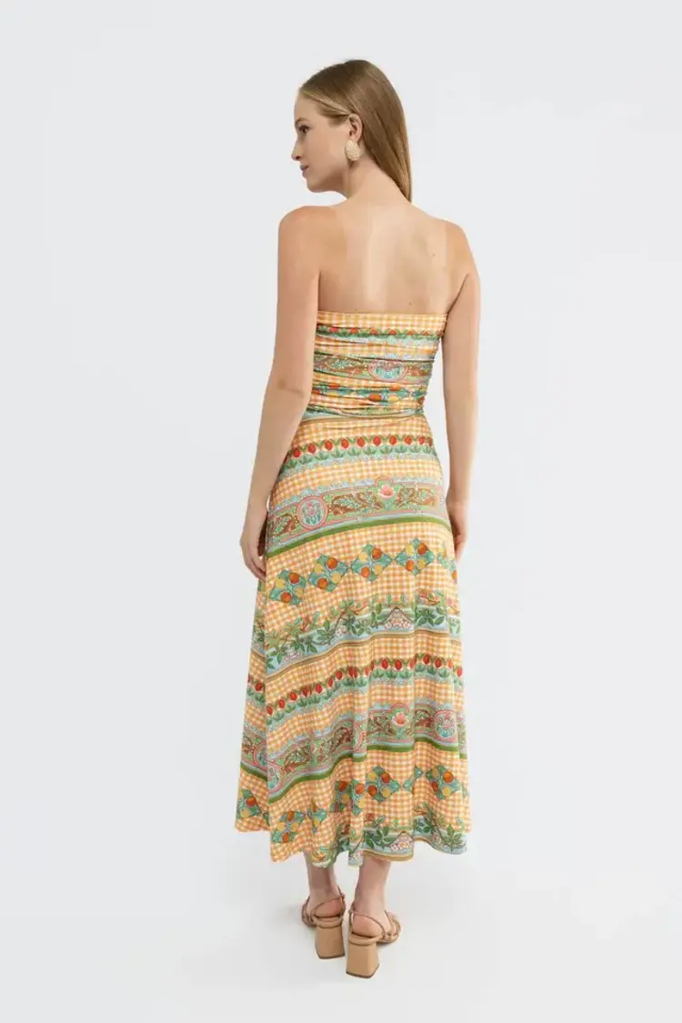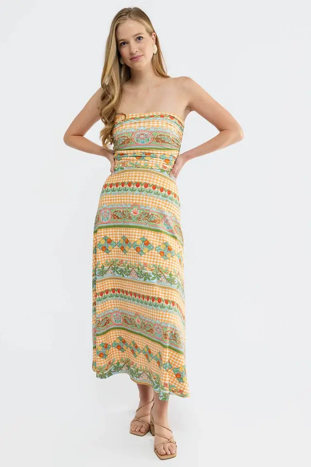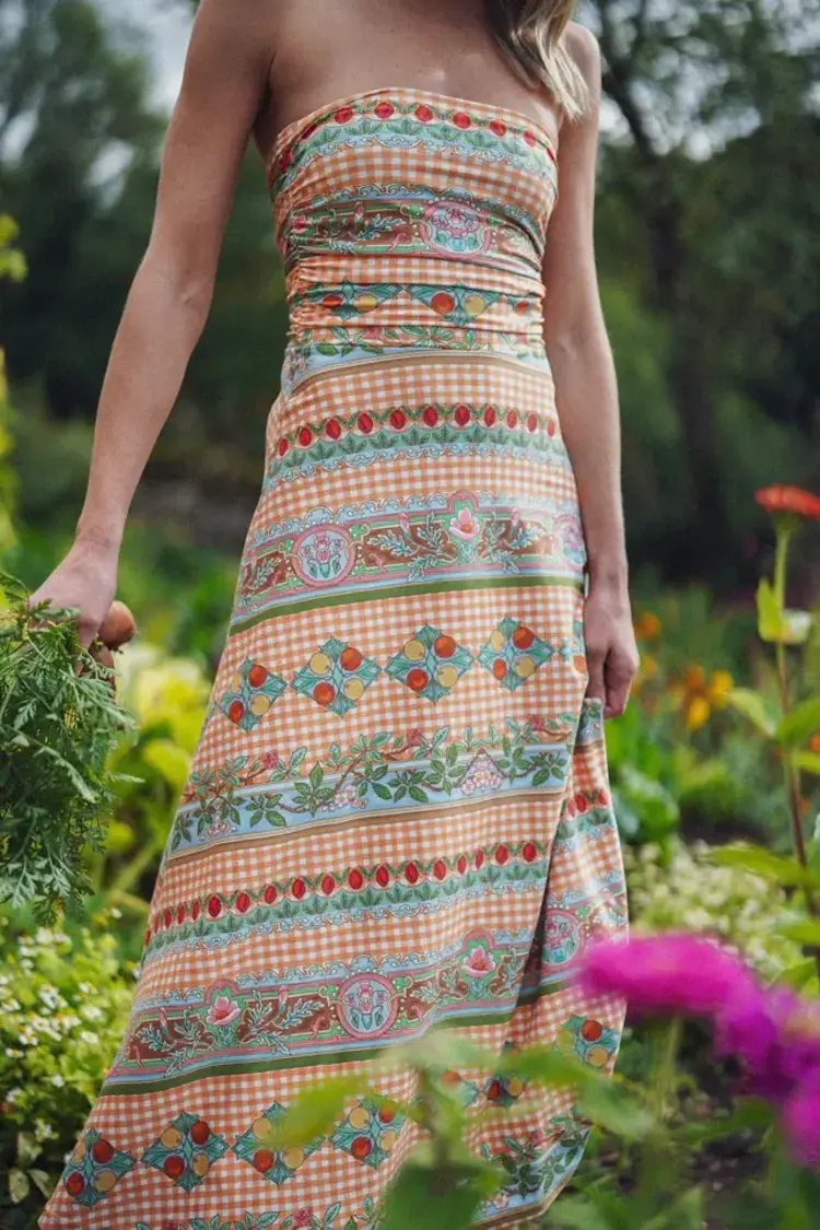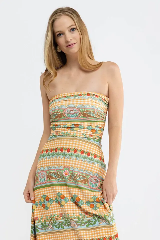Meet the Gloria Dress. Crafted from our S&Q Stretch fabric, the Gloria features a flirty strapless neckline, ruched bodice, and a flattering A-line skirt.
