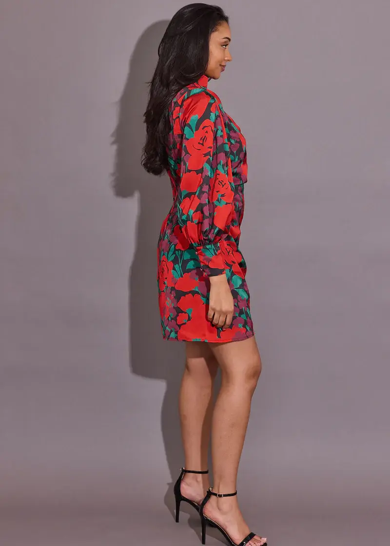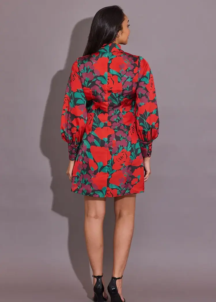 The Gloria Dress in the print legacy floral is a bold, sophisticated silhouette featuring rich red blooms and elegant draping. With voluminous sleeves and a flattering high neckline, it’s the perfect statement piece for any occasion.