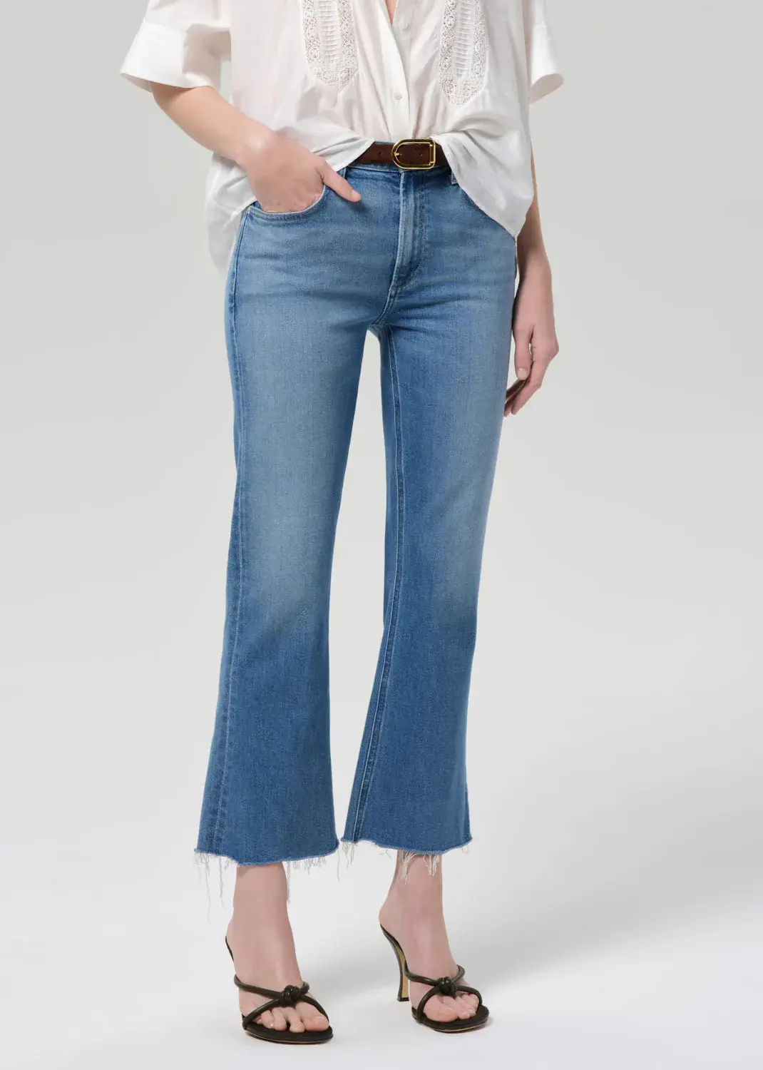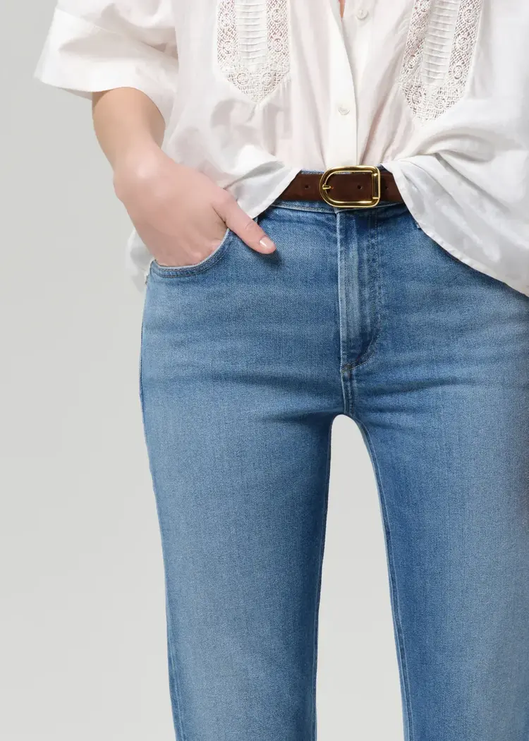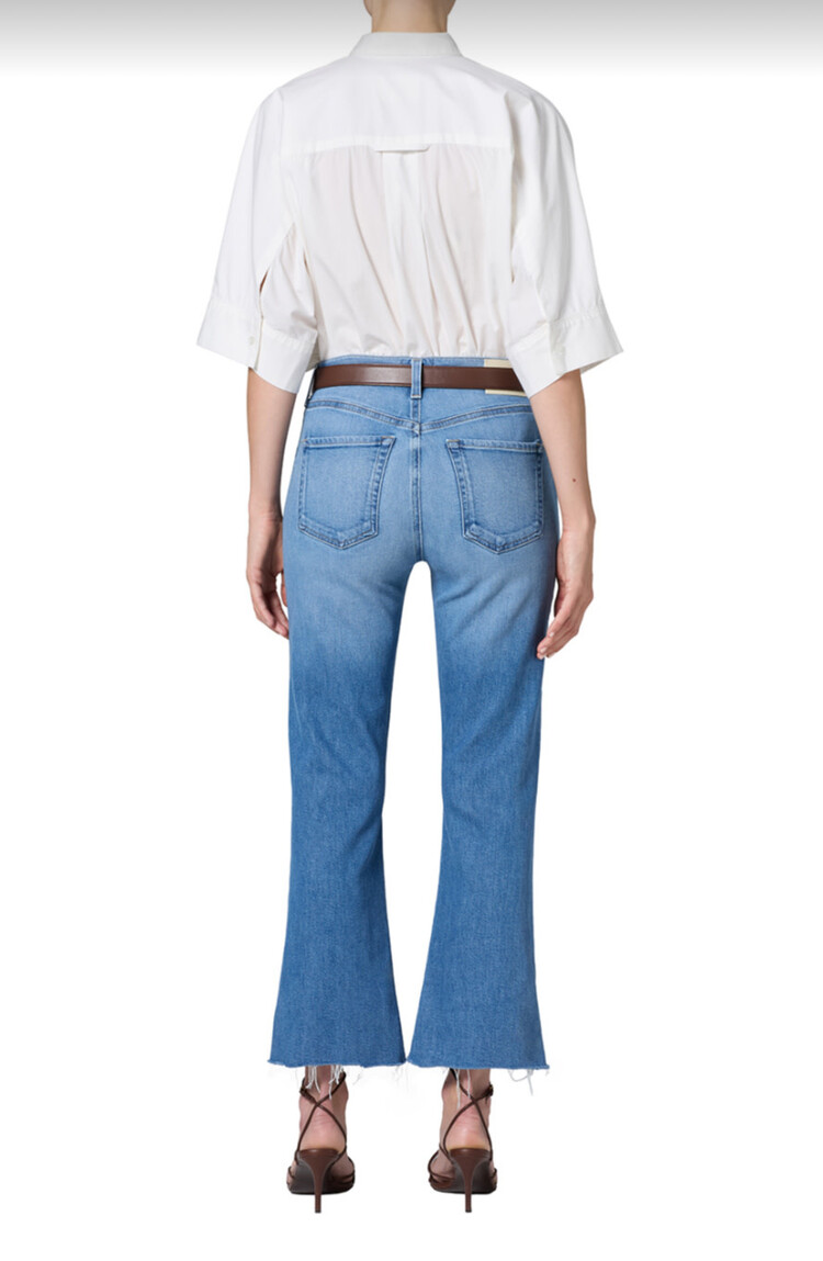 A playful take on ’70s style, the Goldie features a mid-rise silhouette and subtle kick flare hem—perfect for balancing proportions with a vintage-inspired touch. Designed in a medium indigo wash with a frayed hem, it offers a laid-back yet refined feel.