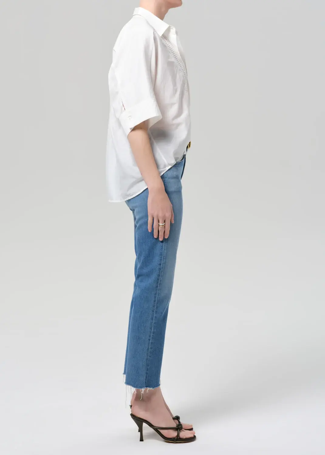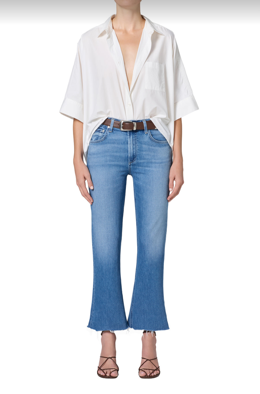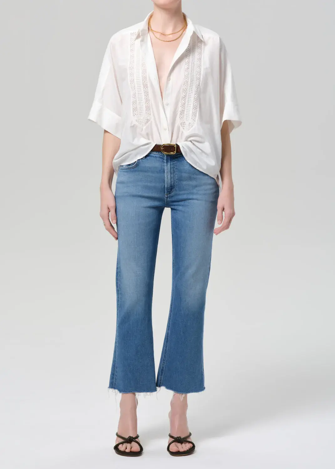 A playful take on ’70s style, the Goldie features a mid-rise silhouette and subtle kick flare hem—perfect for balancing proportions with a vintage-inspired touch. Designed in a medium indigo wash with a frayed hem, it offers a laid-back yet refined feel.