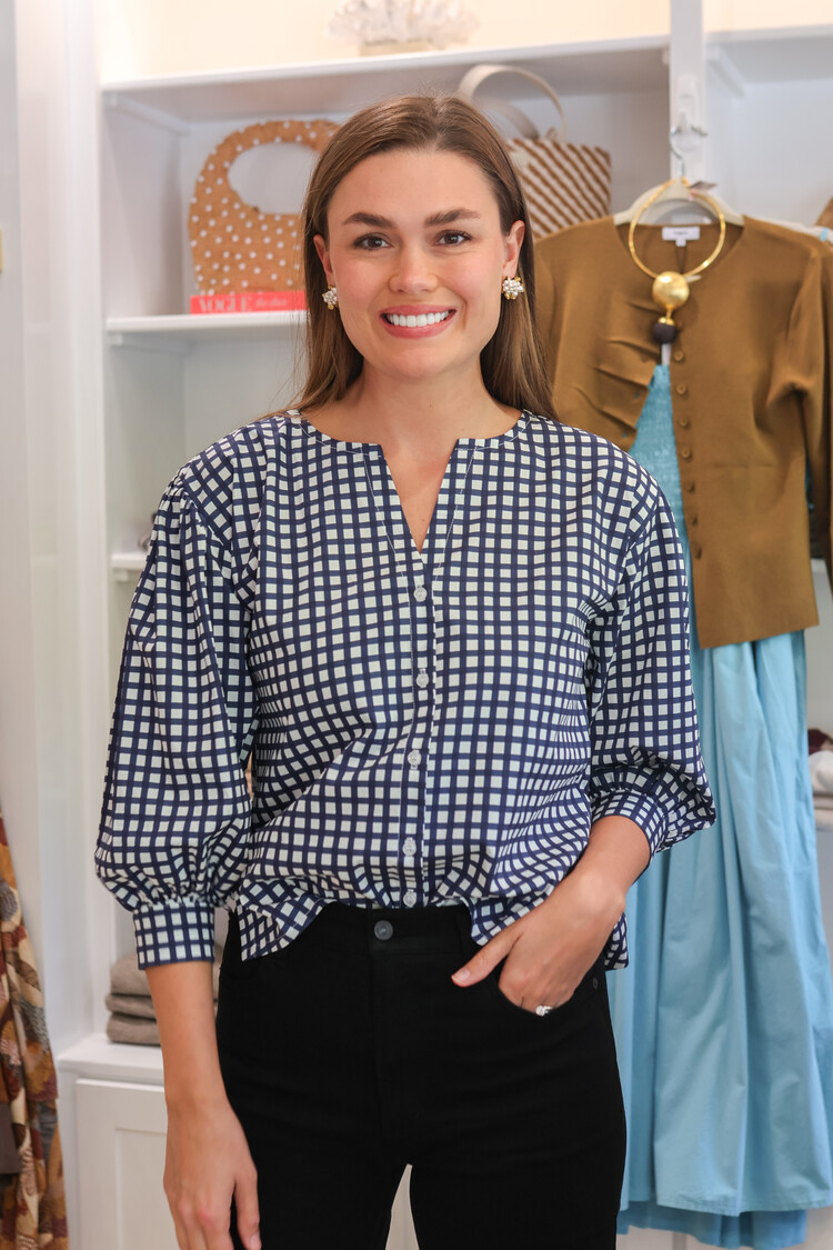 • A Brooke Wright favorite with an easy fit and perfect navy check pattern.