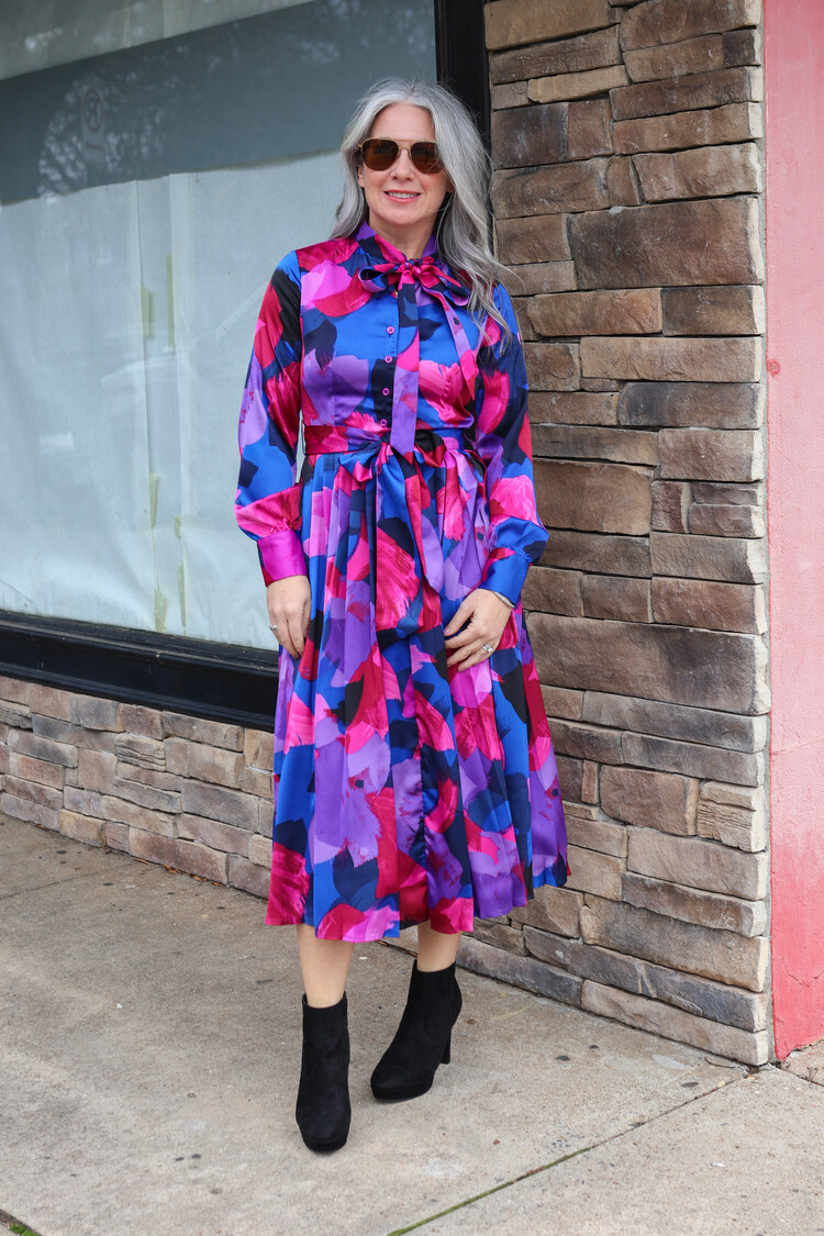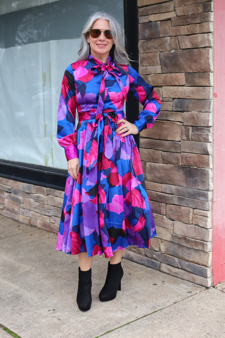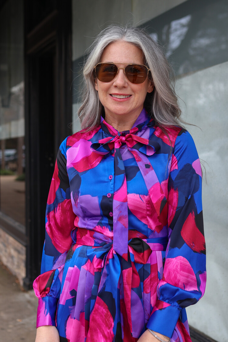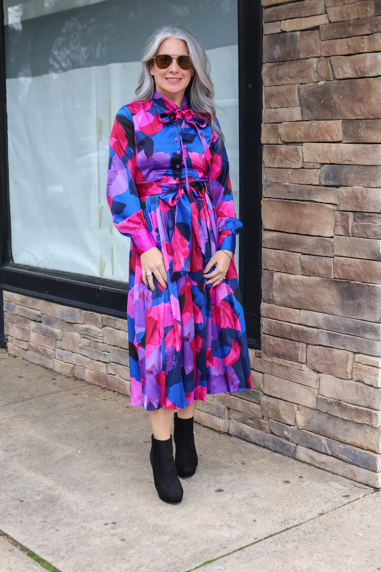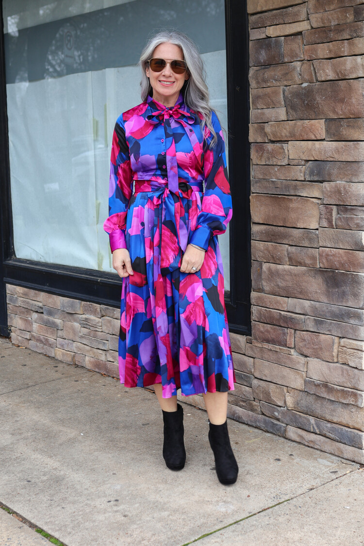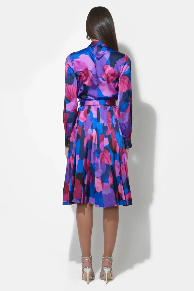 • The design incorporates a classic button-up front leading into a beautifully textured pleated skirt, which provides graceful volume and movement. The silhouette is an elegant midi length, offering formality and coverage.