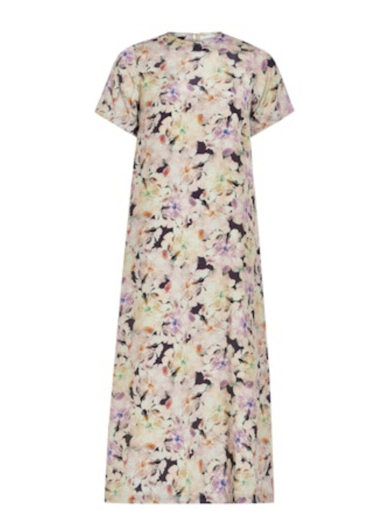 • The Gwenyth Dress features a straight silhouette with a midi length and a discreet back slit, providing ease of movement and comfort. Its short sleeves and round neckline make it suitable for casual wear or elevated occasions like a date night.