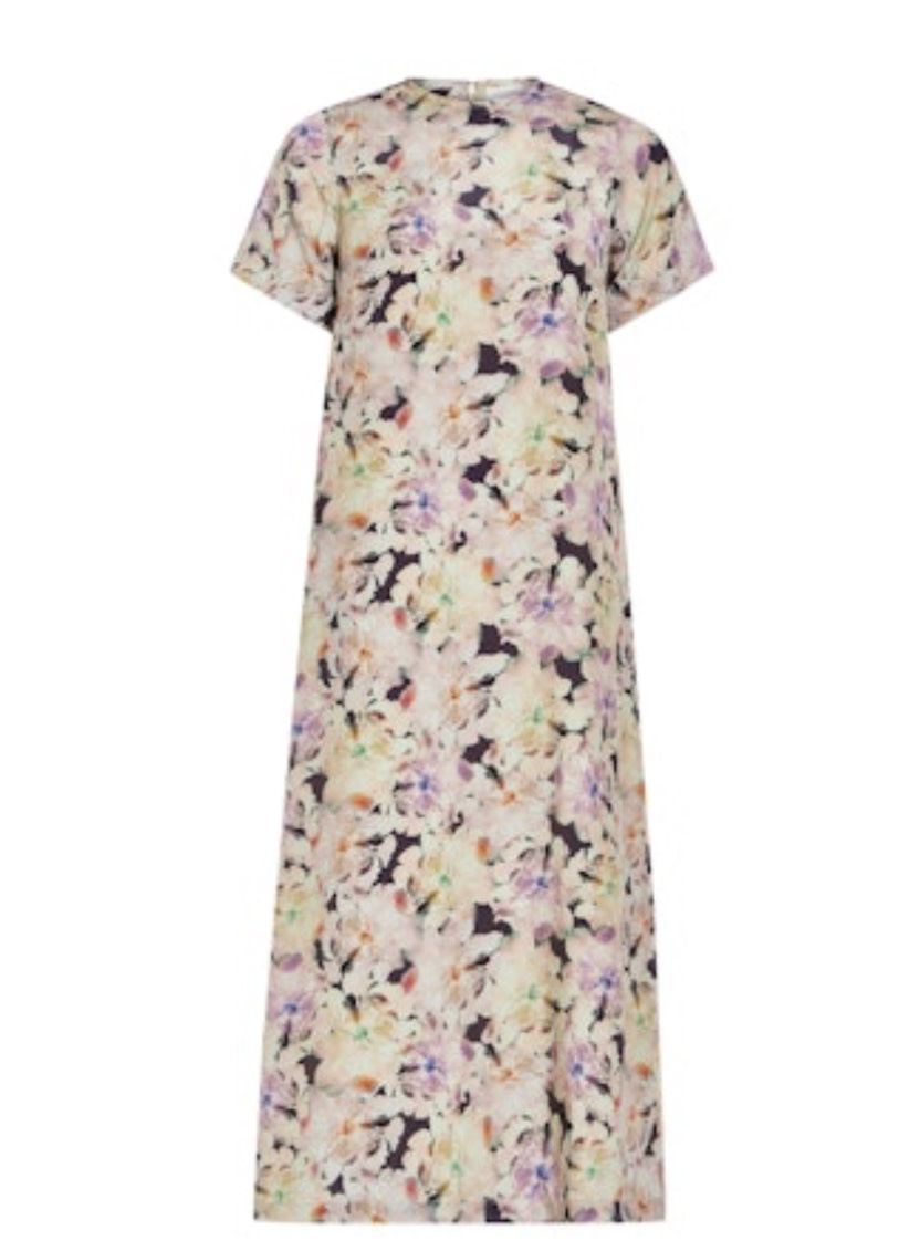 The Gwenyth Dress features a straight silhouette with a midi length and a discreet back slit, providing ease of movement and comfort. Its short sleeves and round neckline make it suitable for casual wear or elevated occasions like a date night.
