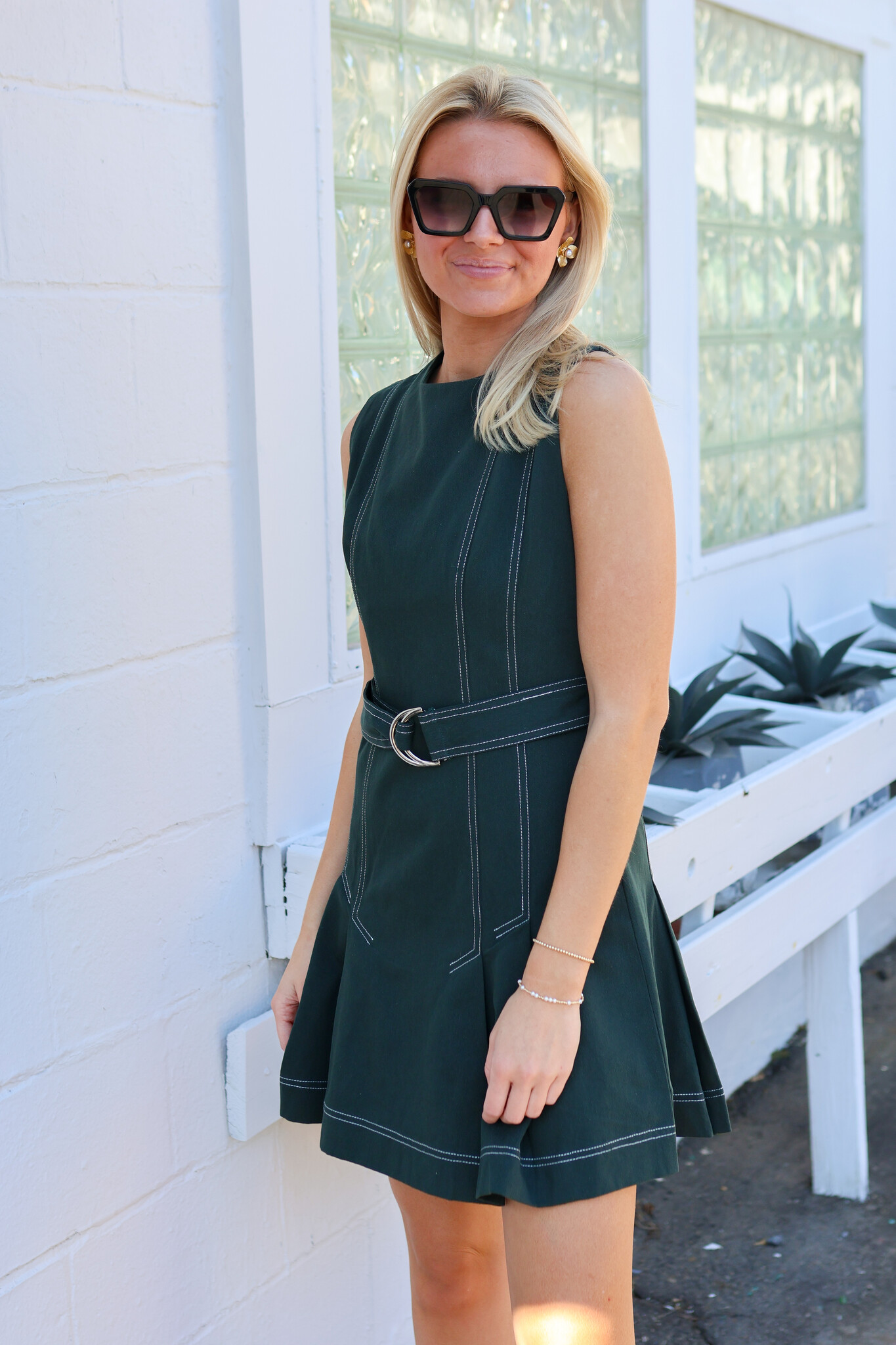 • This sleeveless mini dress features contrast topstitching, front pleats, and a matching belted waist. A polished, tailored silhouette with a modern edge and back hidden zipper closures.