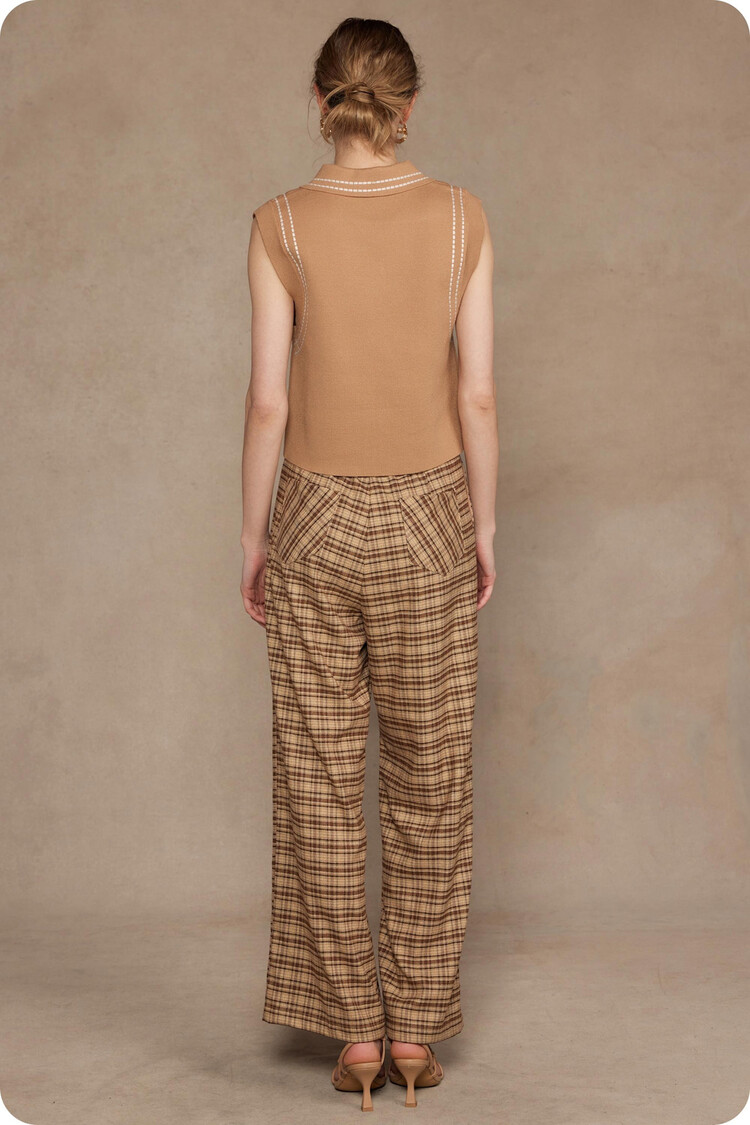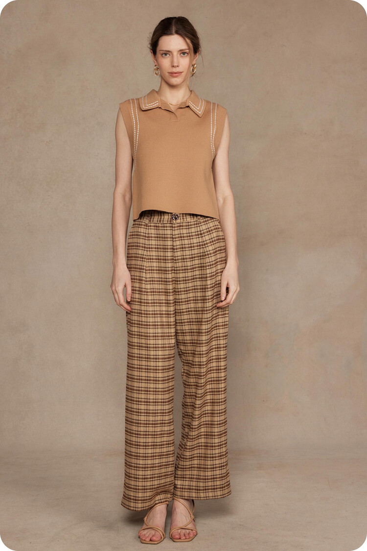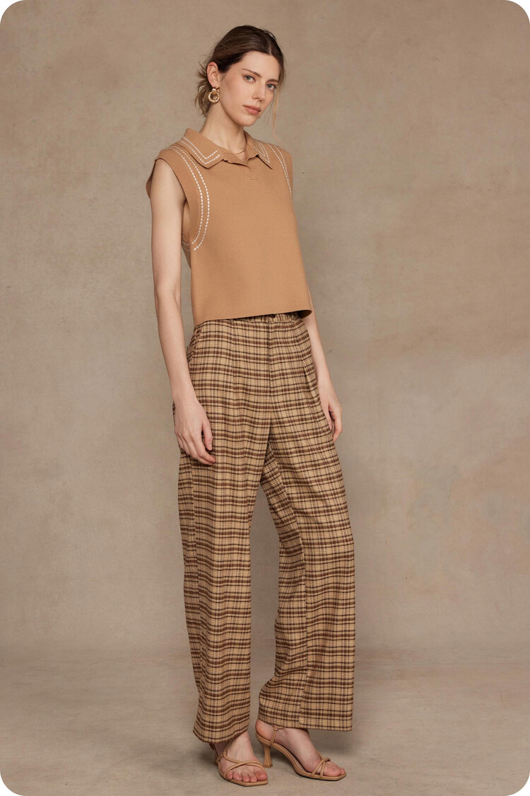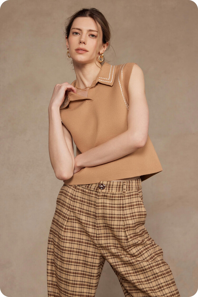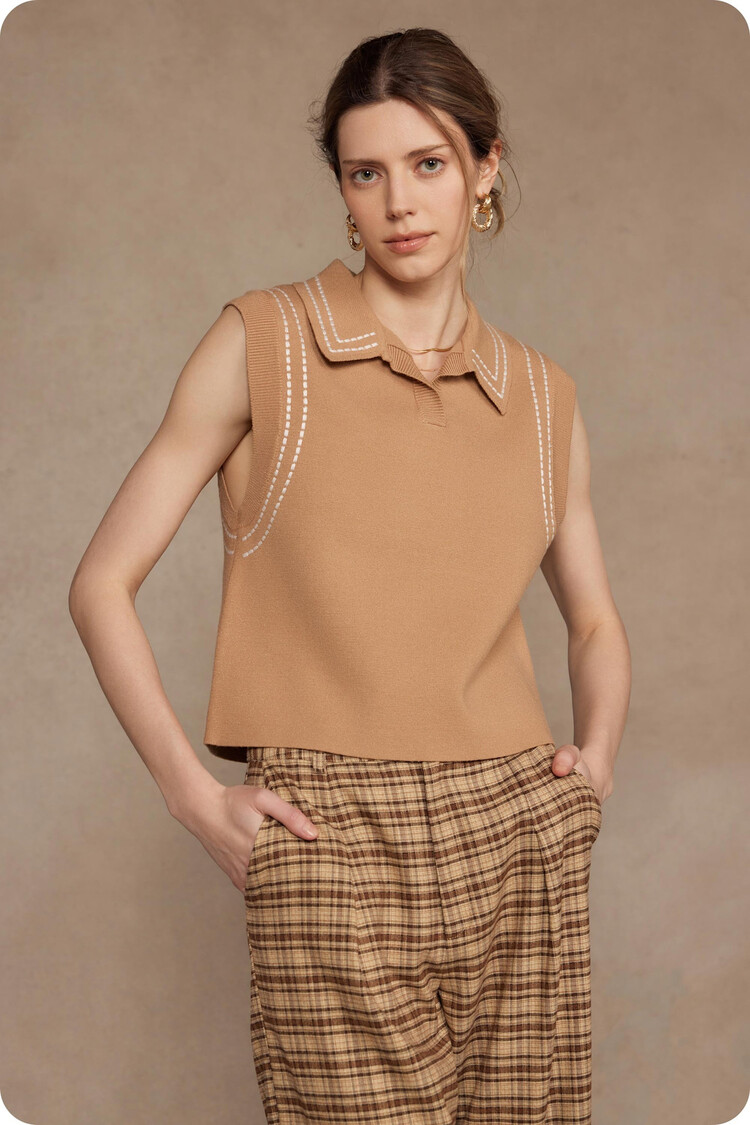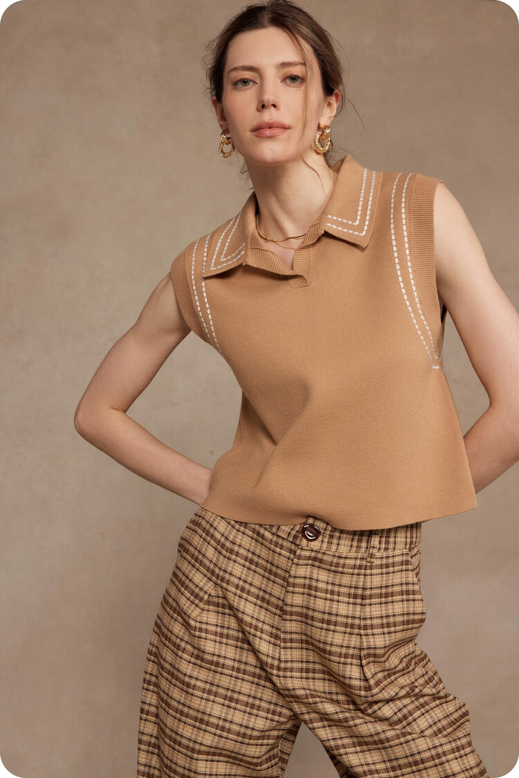 • Thick stitch embroidery sleeveless polo top in stretch knit fabric. This versatile knitted sleeveless top features spread collar, thick stitch embroidered detail throughout, and a relaxed fit.