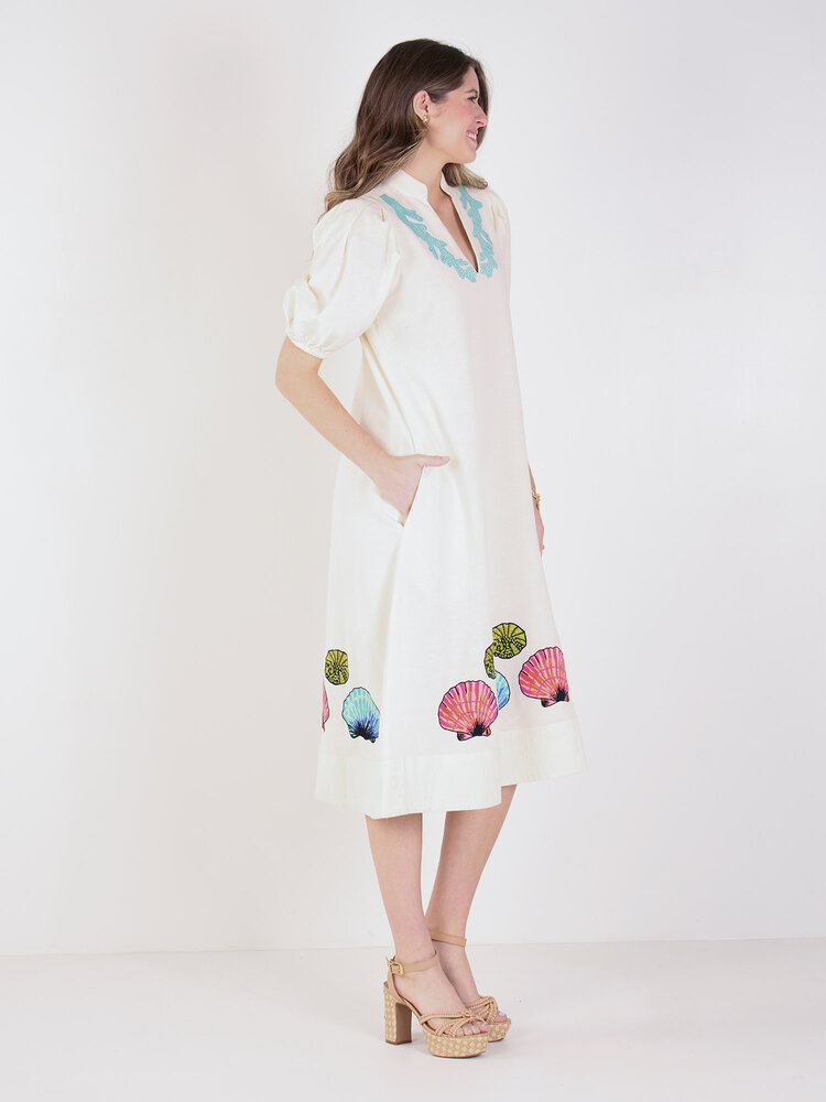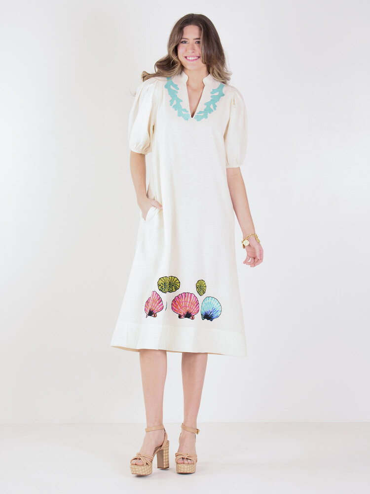 • The Hampton Dress in Seaside is a coastal-inspired dress featuring a mandarin-style collar, soft puff sleeves, and a loose-fitting silhouette for relaxed comfort. Embroidered coral details frame the neckline, while colorful seashells wrap around the hem!