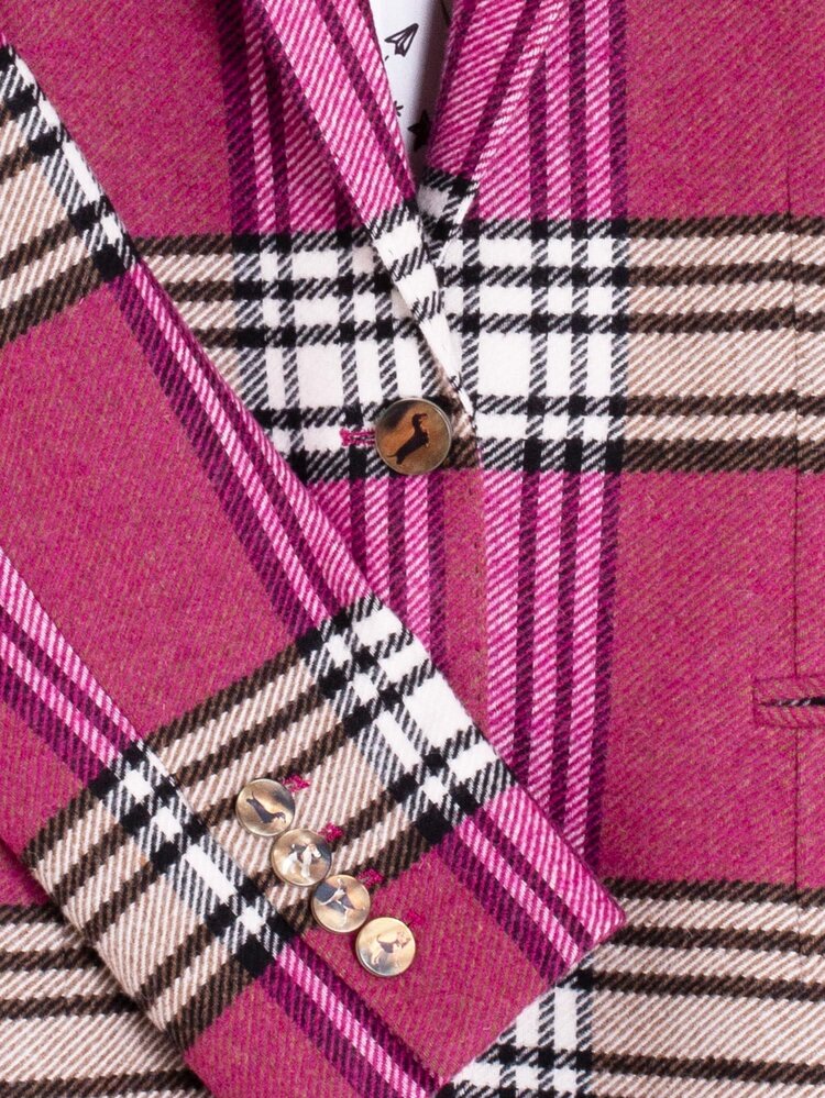 • Blazer in raspberry and beige checks with black and white lines. Straight cut with classic lapel collar and a single front button featuring a dog silhouette. Three contrast buttons on each cuff. Printed inner lining with graphic motifs. Wool blend fabric