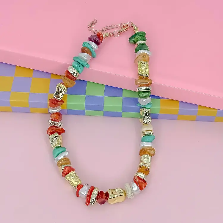 • This necklace is a playful mix of bold beads, whimsical shapes, and shiny gold accents.