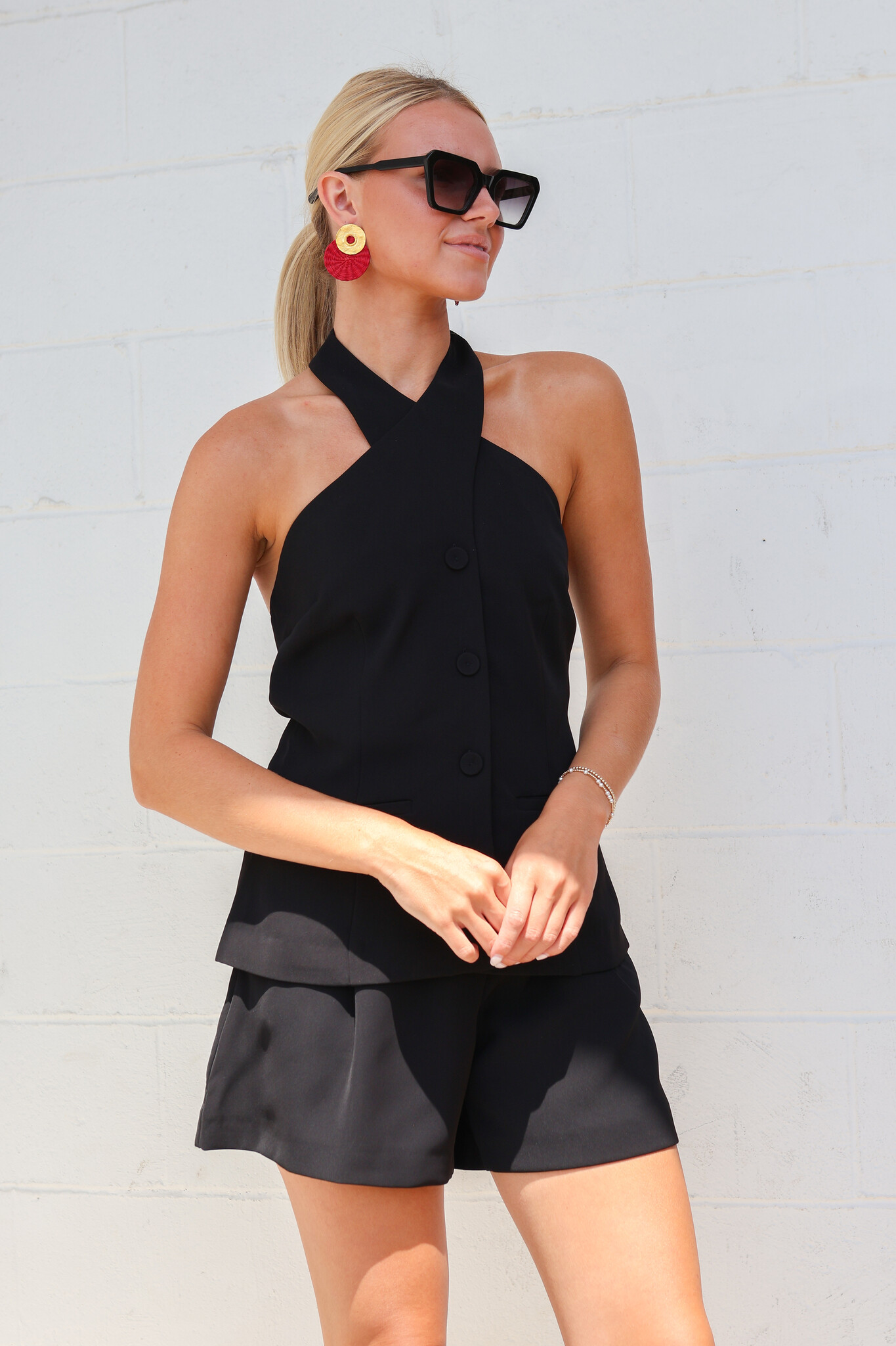 The Harry Cross Neck Vest reinvents the classic button-down with a crossover halter neckline and open back, bringing sleek sophistication to your wardrobe.