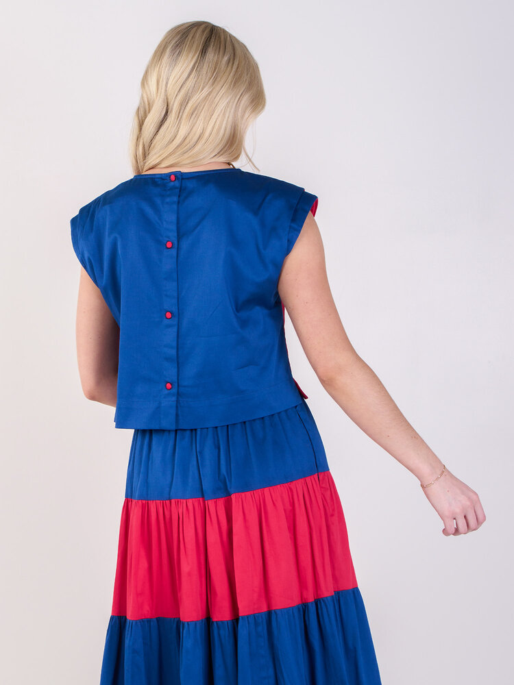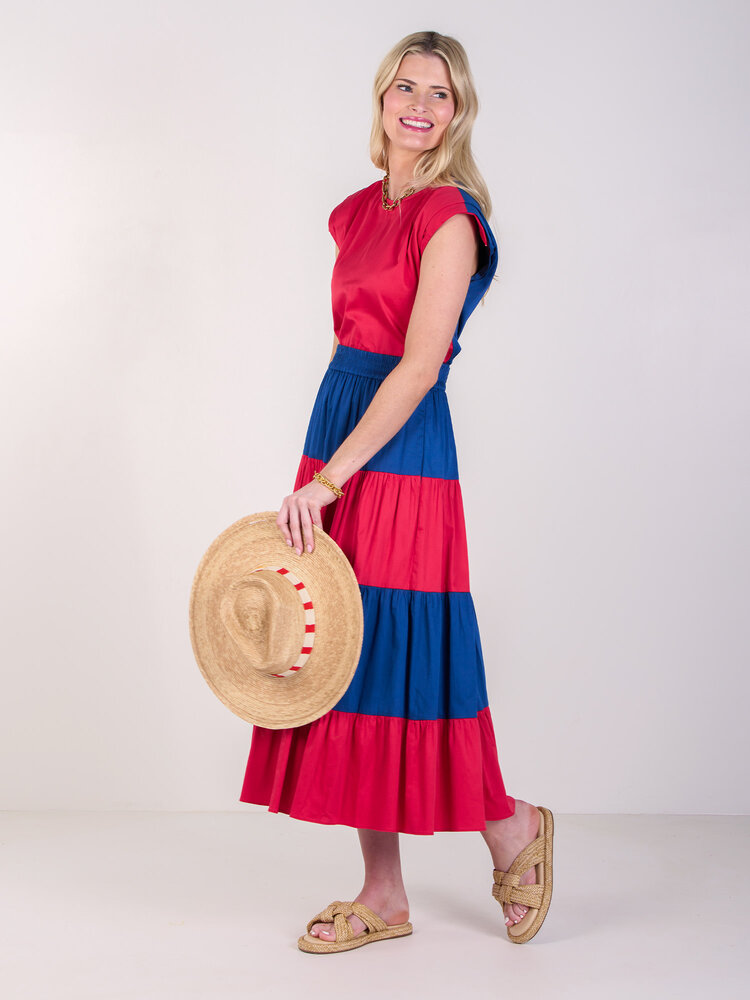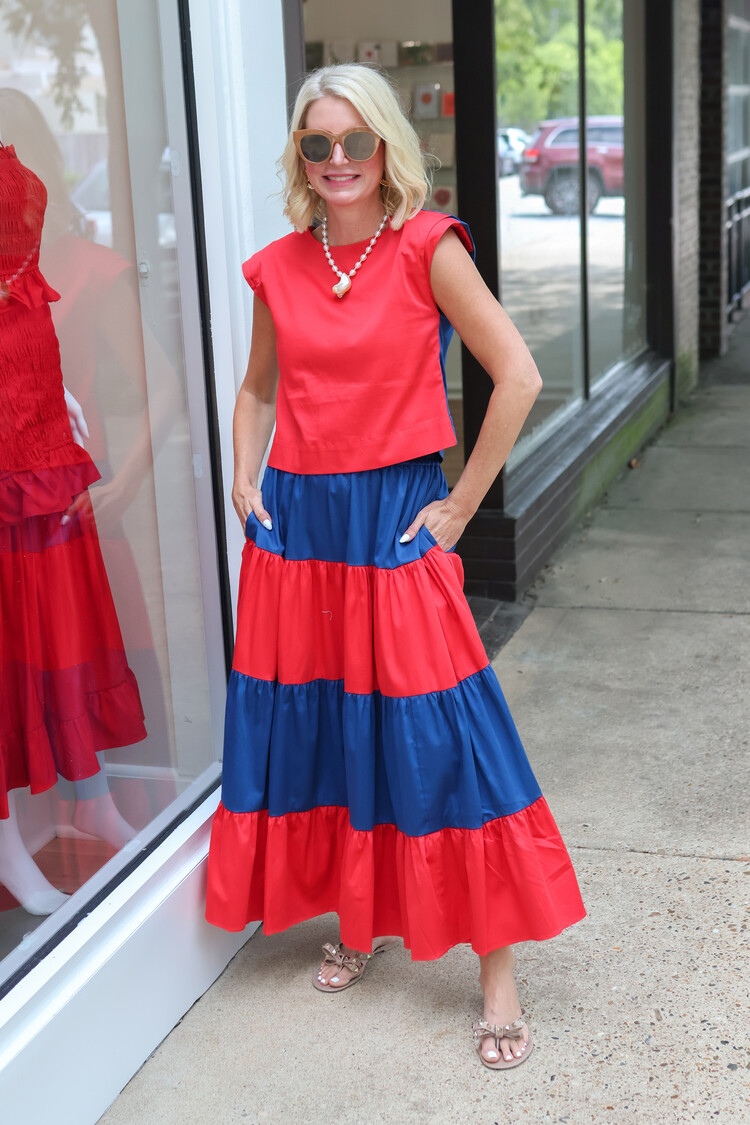 The Tiered Maxi Skirt in Americano brings bold, patriotic fashion to summer styling. Crafted in crisp cotton poplin, its color-blocked tiers create playful movement and volume, while the elastic waistband offers a comfortable, figure-flattering fit.