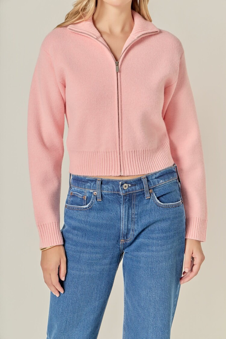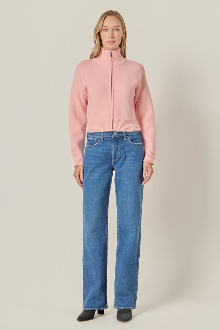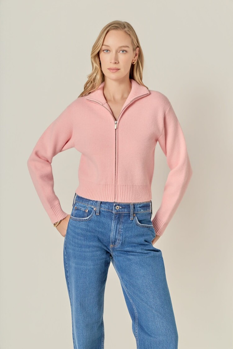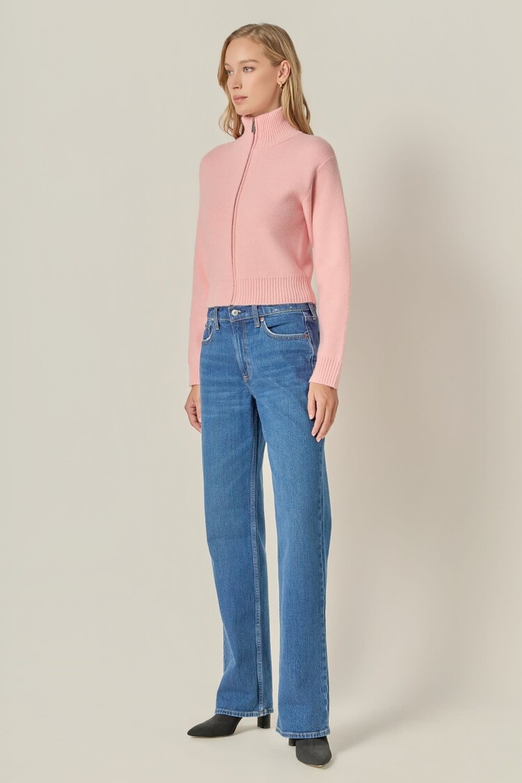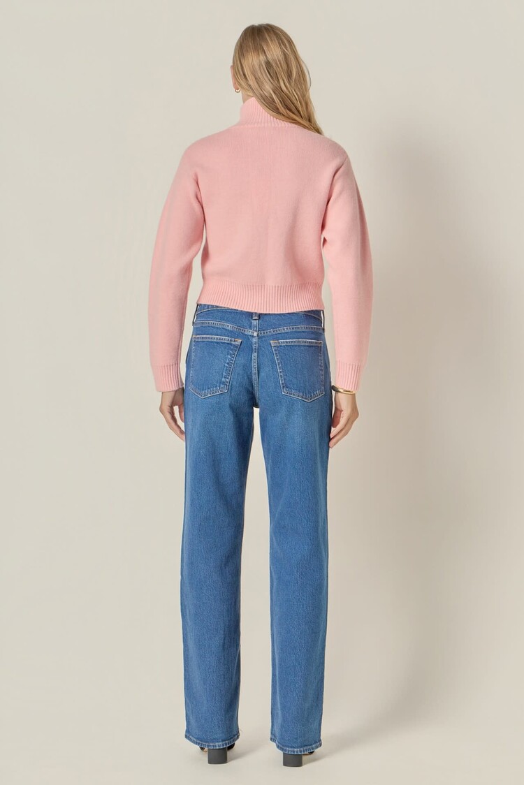 Fuchsia pink sweater in a lightweight wool blend. It features a high neck, straight cut and fluid fabric. Contrasting navy piping highlights the neckline, sleeves and a along the back. The seams are intentionally visible, creating a clean finish.