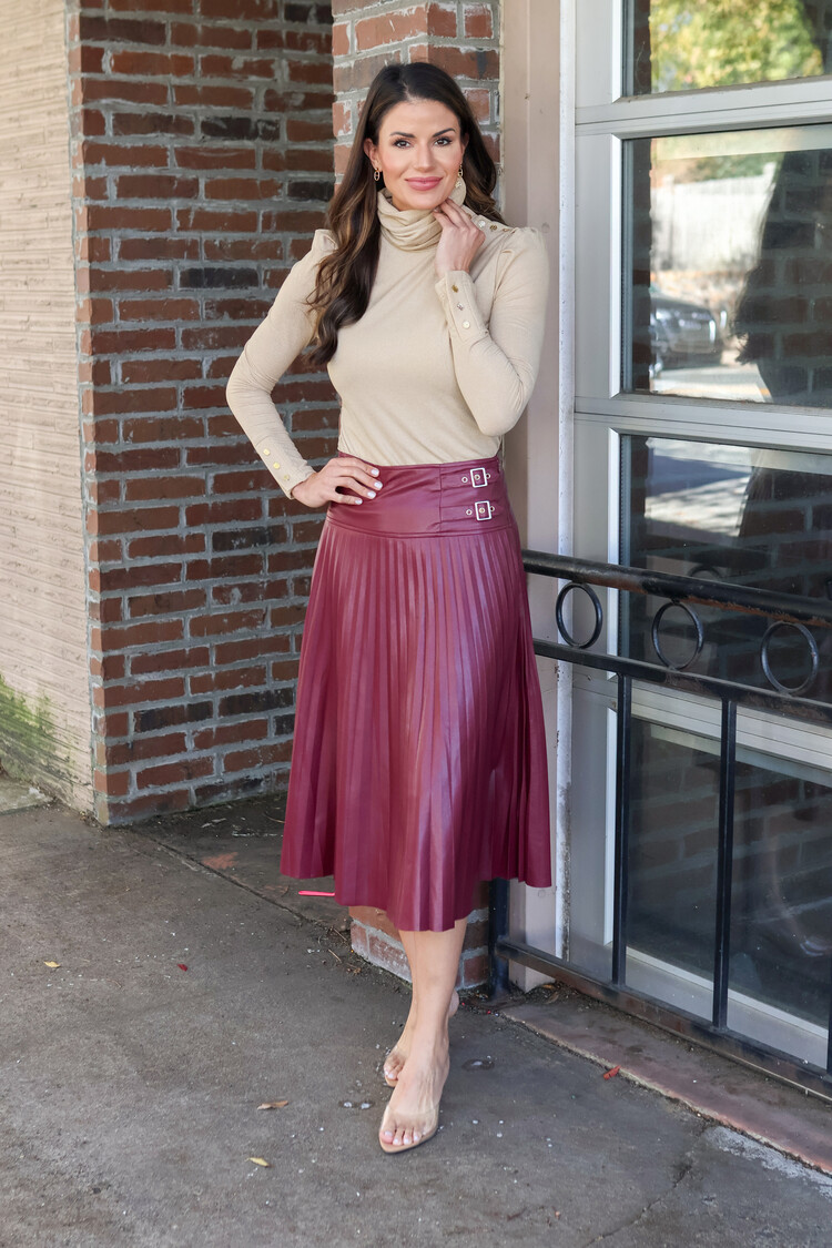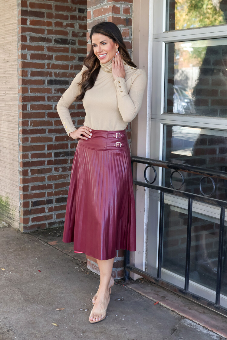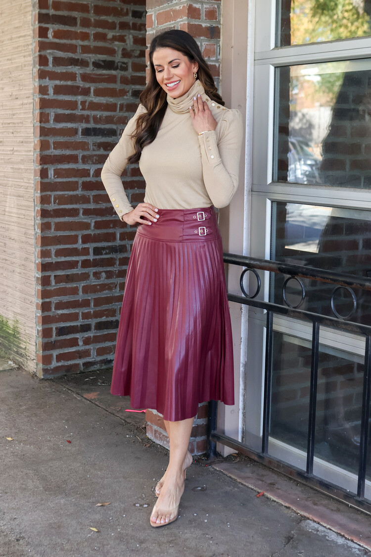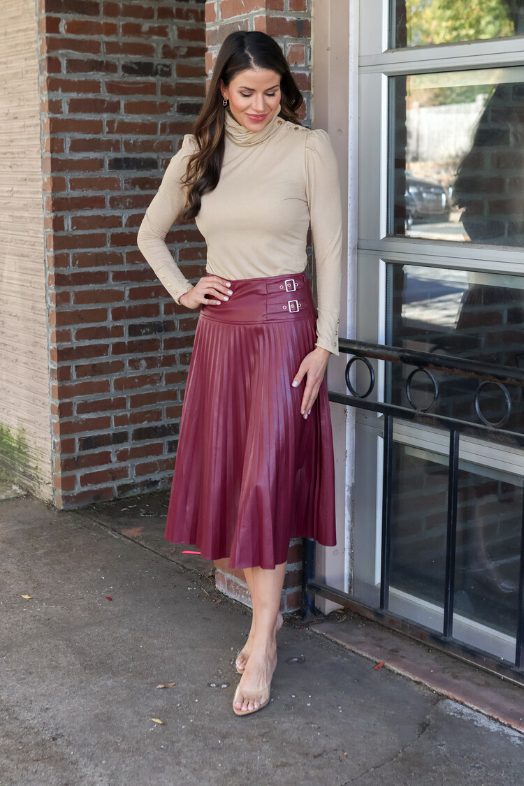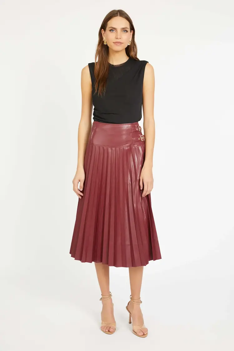 • Crafted from sleek faux leather, this bold piece features cascading pleats that create elegant movement and flow. The wide, smooth waistband is finished with two decorative buckles, adding a polished touch while flattering the waist.