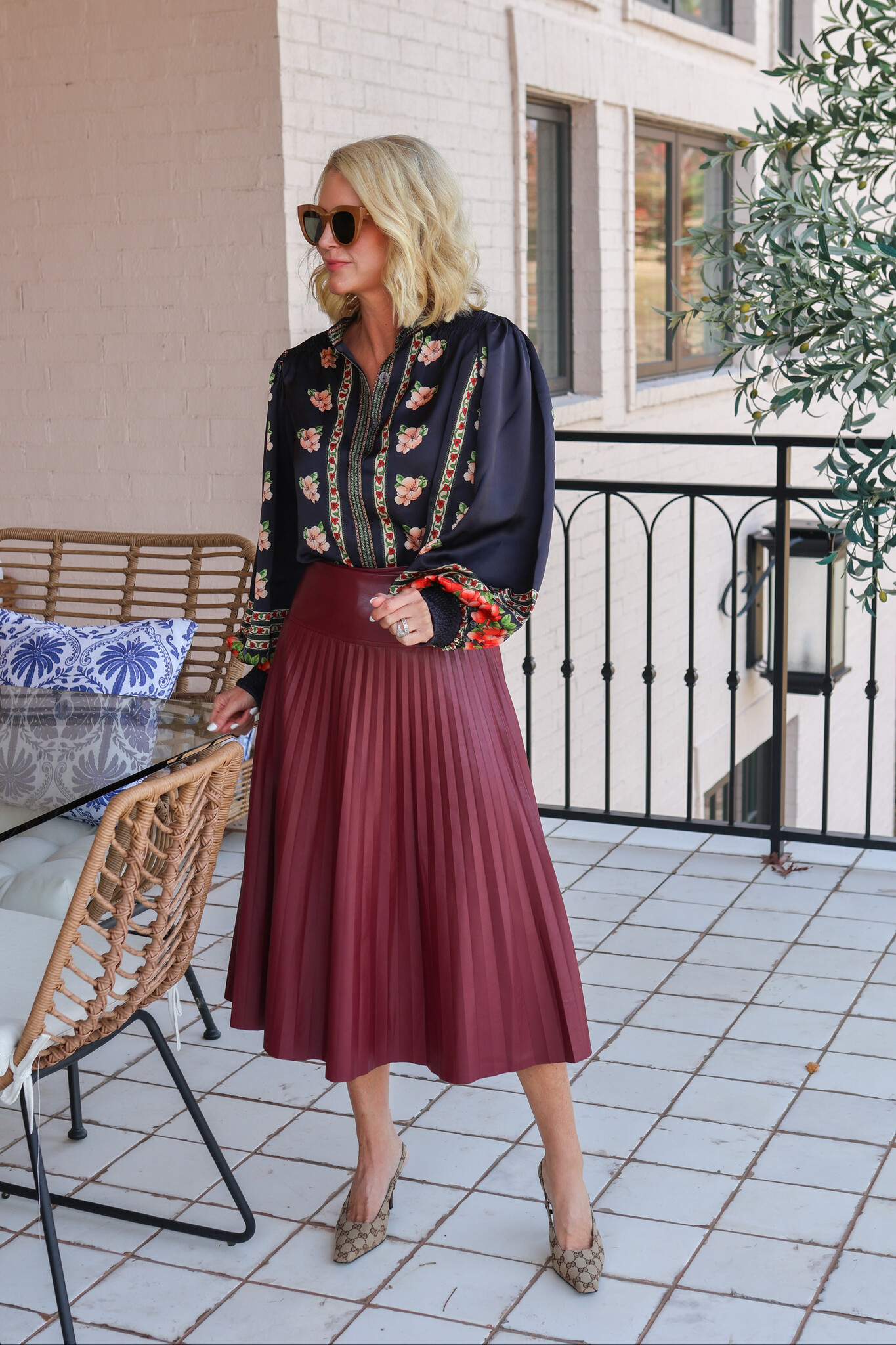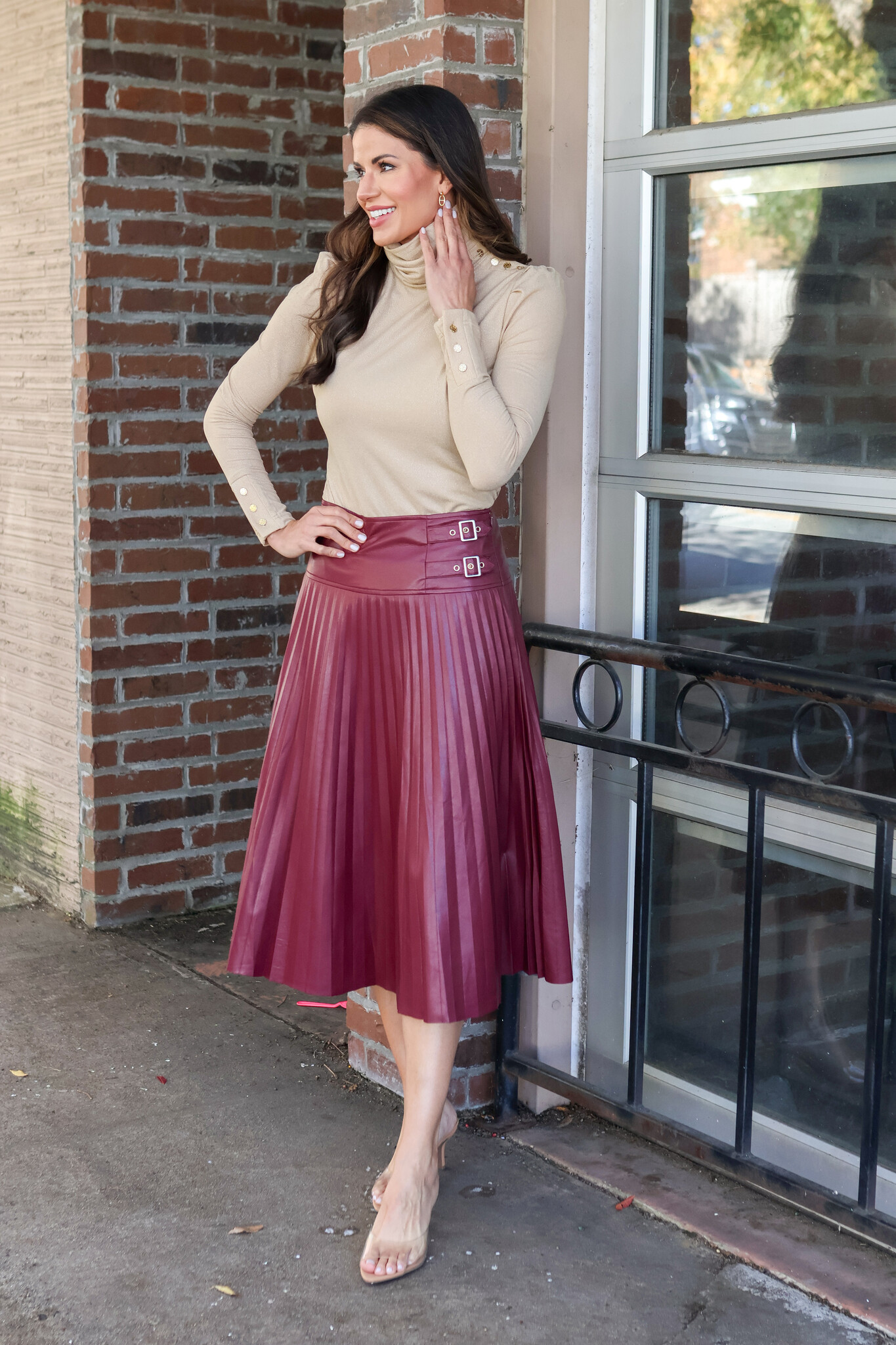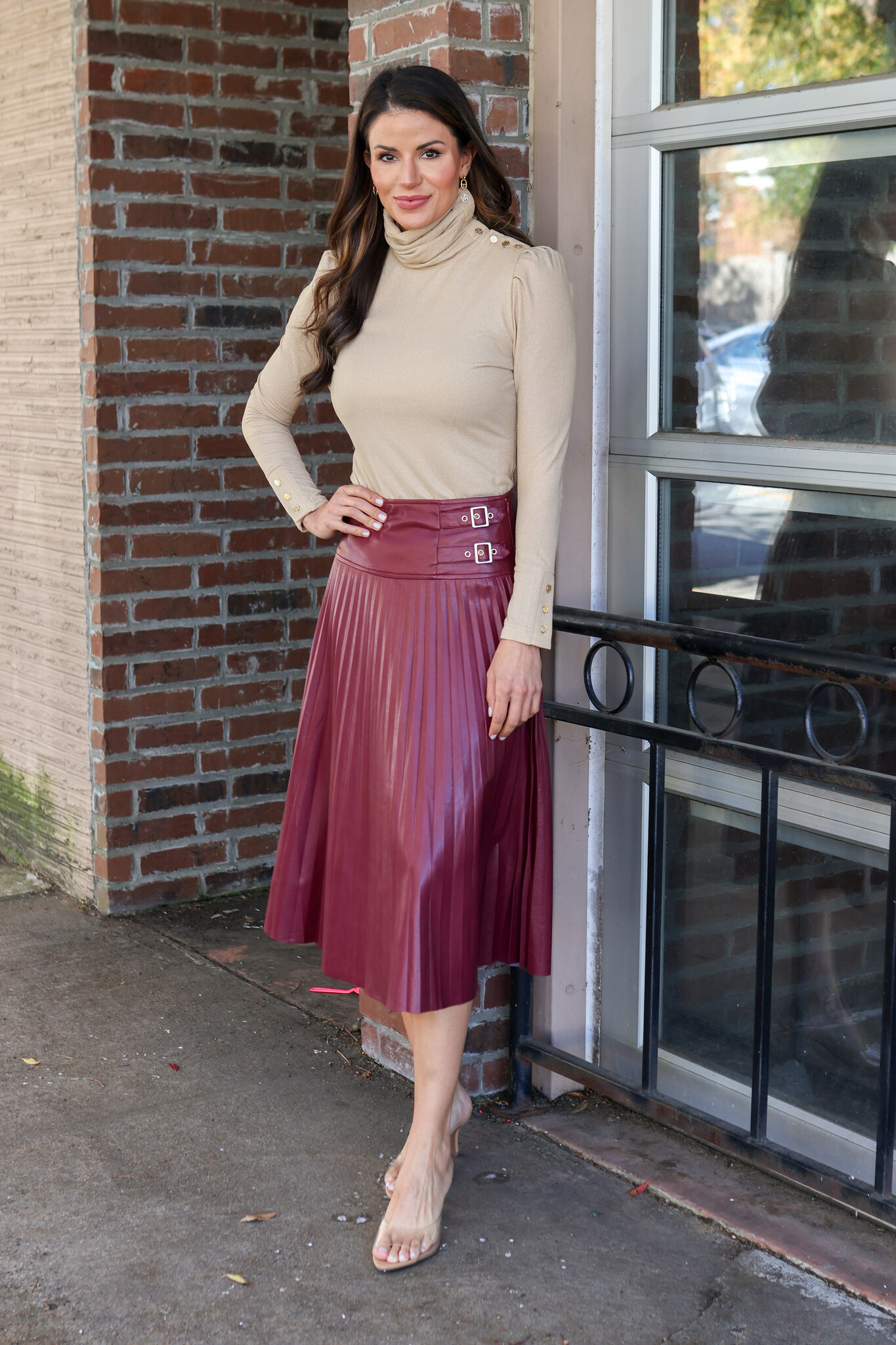 Crafted from sleek faux leather, this bold piece features cascading pleats that create elegant movement and flow. The wide, smooth waistband is finished with two decorative buckles, adding a polished touch while flattering the waist.