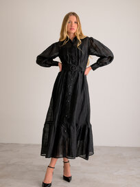Straight-cut black coat with front double-breasted closure and wide velvet lapel in matching tone. Back strap and flap pockets also feature velvet contrast. The interior is finished with a printed lining. Covered buttons complete the refined structure.