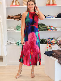 100% polyester. It features a halter neckline for a modern, elegant touch and a pleated design that moves beautifully with every step. A thin elastic waistband adds subtle shape and comfort, while a side slit in the skirt brings an airy, effortless feel.