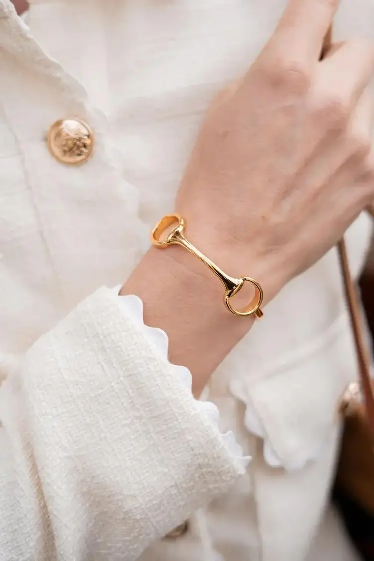 • The Gold Horse Bit Cuff is a must-have for all equestrian enthusiasts! Crafted from 18k gold-plated metal, it’s a sophisticated staple that effortlessly combines charm and versatility.