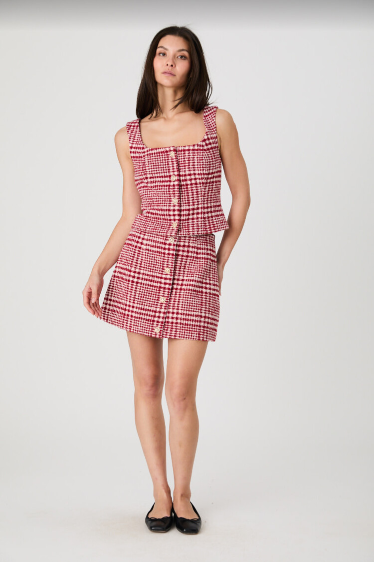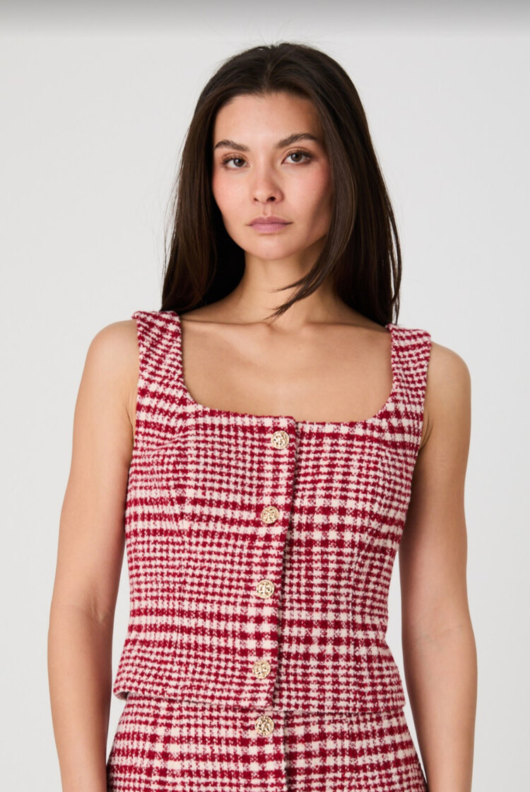 • Gives “put-together” without trying too hard. With a structured fit, square neckline, and chunky gold buttons, the Brushed Houndstooth Sleeveless Top is as polished as it is wearable. Match it with the coordinating mini skirt!