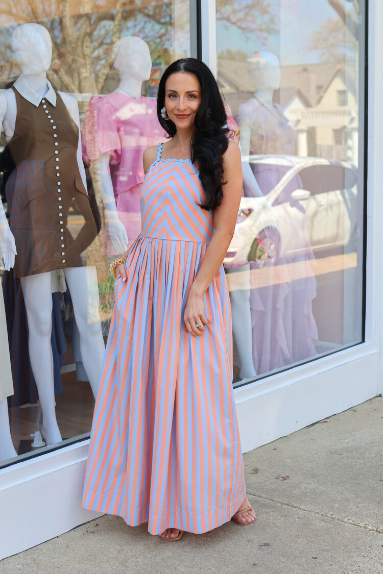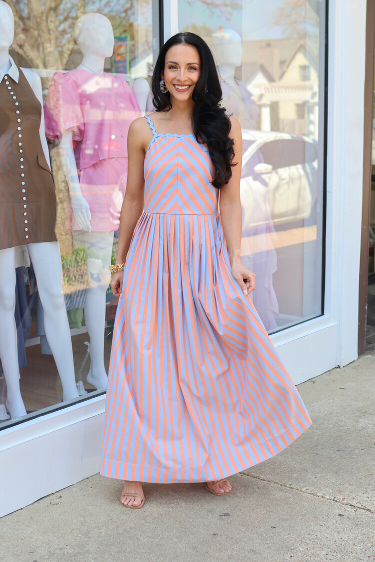 Earn your style stripes with our Imelda dress. The dress has a two tone stripe pattern, in a gorgeous blue and peach color way. The pastel colors complement any complexion. Imelda has a straight neckline, ric rac trim, side pockets, and a pin tuck waist.