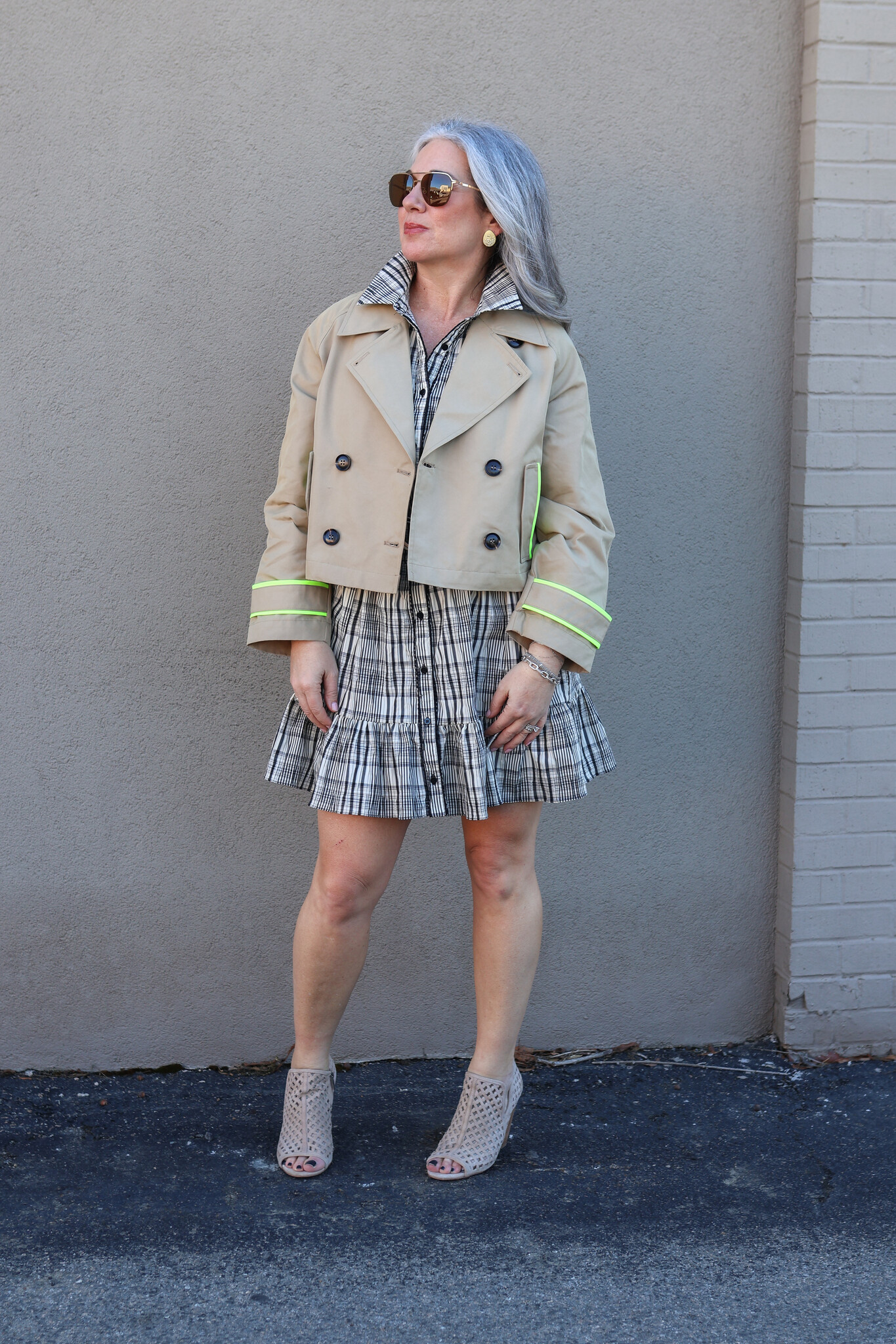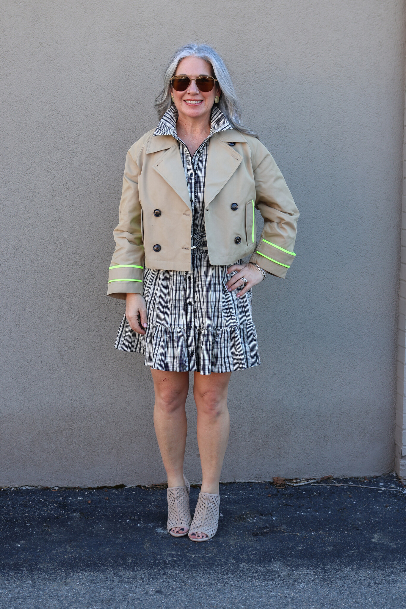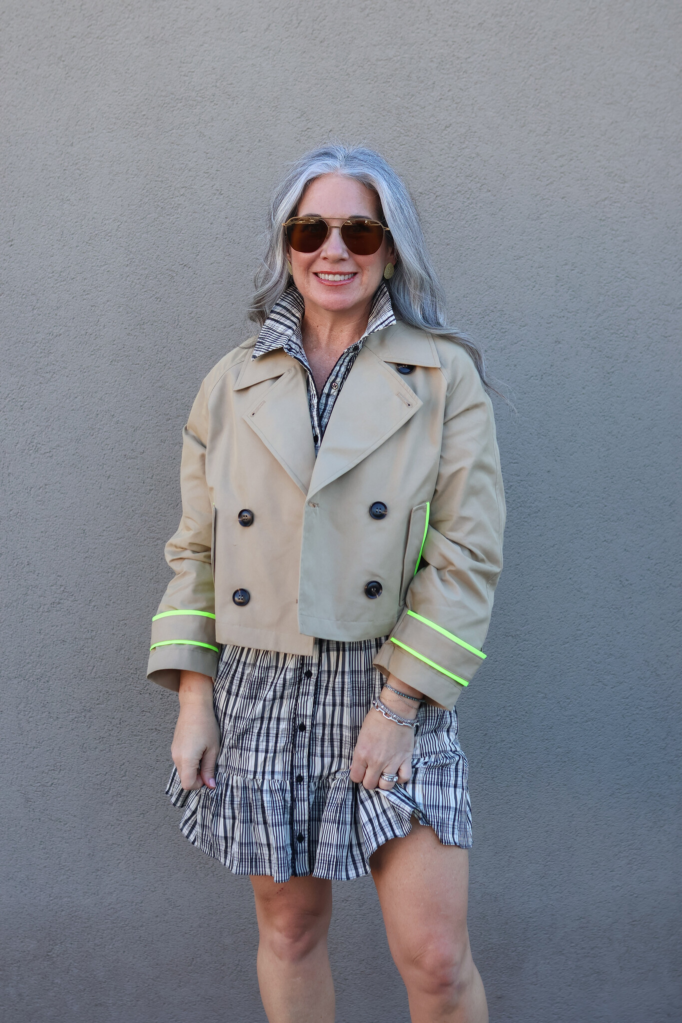 The Lisa Todd IN TRENCH jacket reimagines a wardrobe staple with contemporary flair. This cropped, double-breasted silhouette combines timeless trench elements with striking neon piping for modern visual interest.