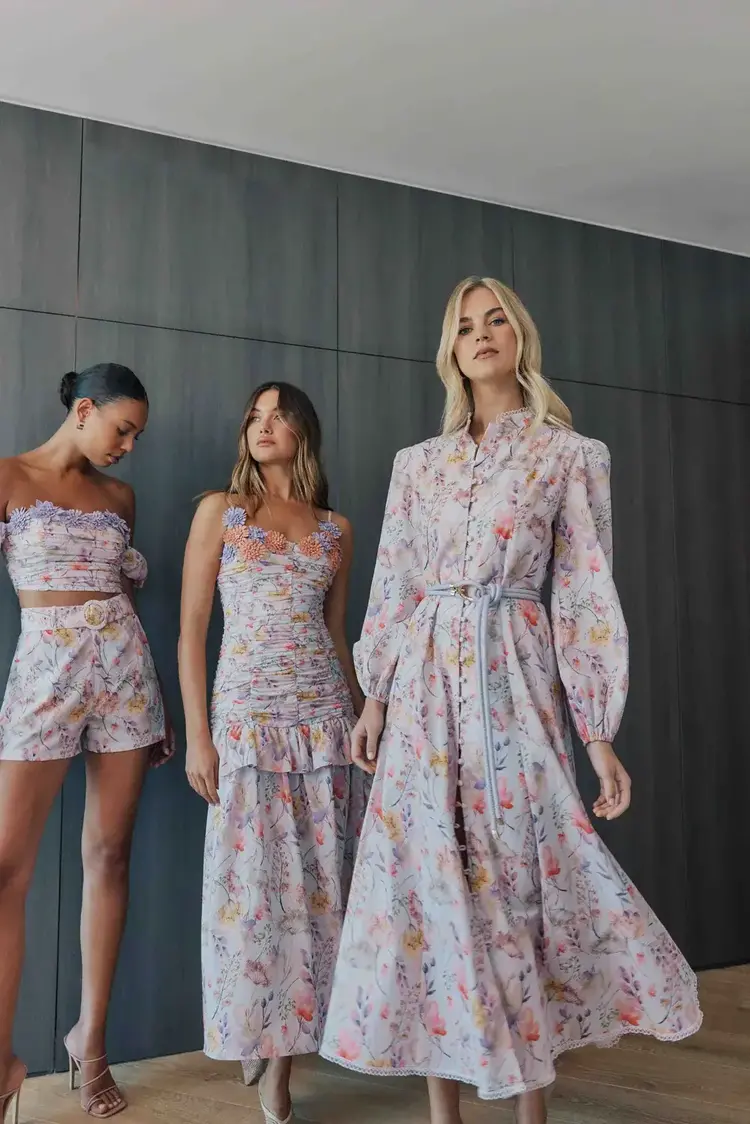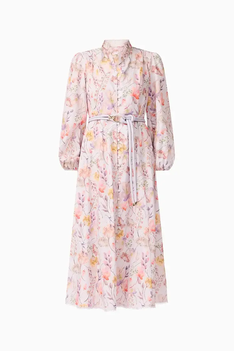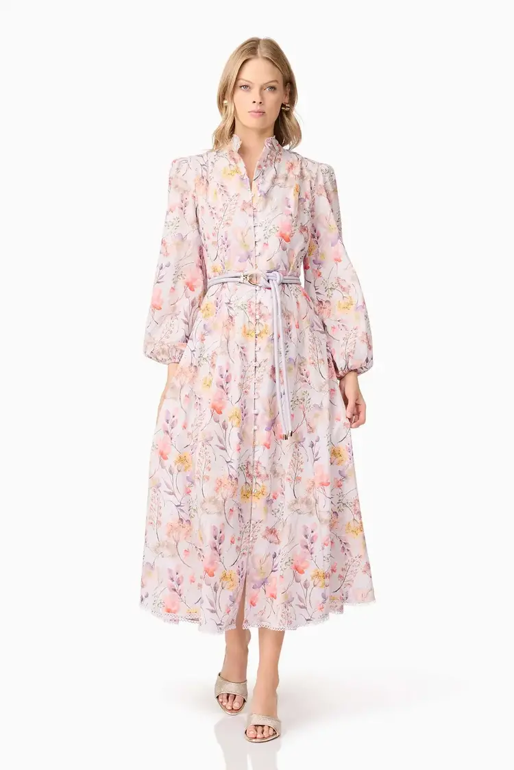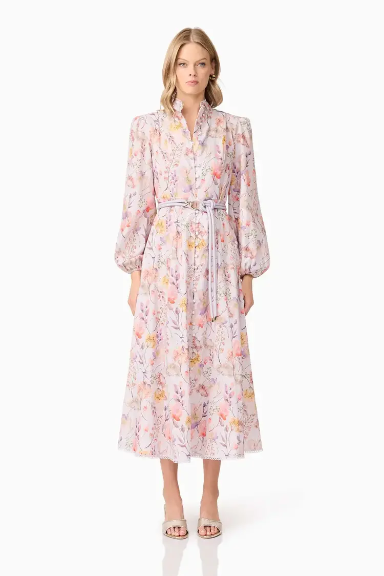 • Designed in a soft lilac hue with a delicate floral print, this long-sleeve shirtdress blends romantic charm with functional design. Crafted from a premium cotton-linen blend, it offers breathability and comfort while maintaining a polished look.