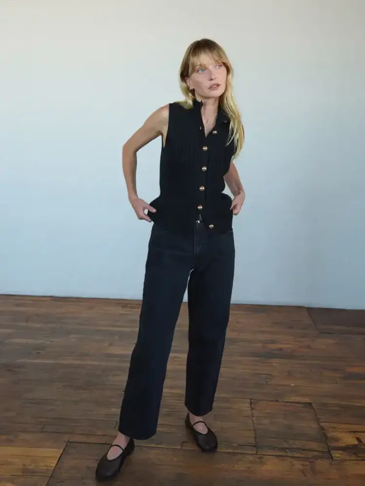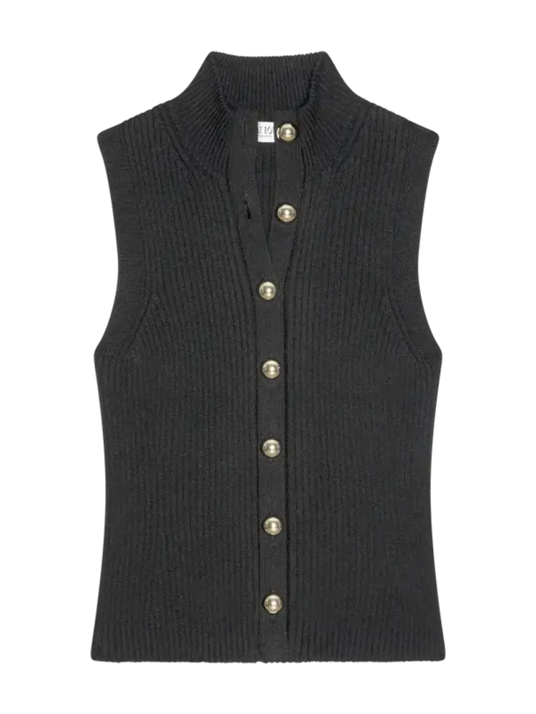 • This timeless cotton cashmere sweater vest hits right at the hip and includes details like a mock neck, luxe ribbing, and gold dome buttons. This one comes in Jet Black.