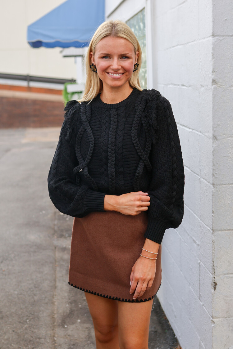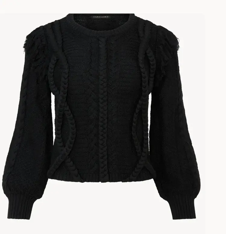 • It features a relaxed silhouette with blouson sleeves, offering comfort and style. Fringe at the shoulders adds a playful touch, while braided detailing along the body and sleeves brings rich texture and visual interest to this fun, cold-weather essential
