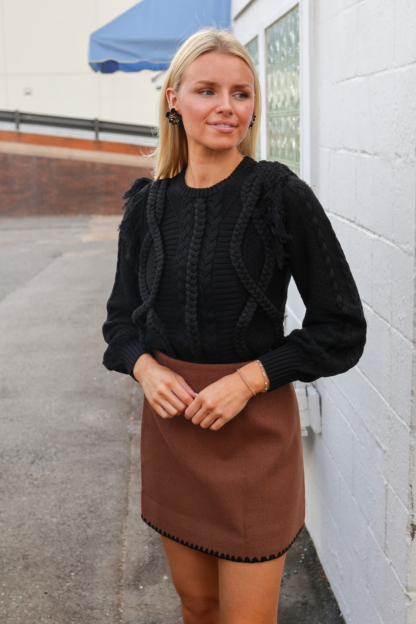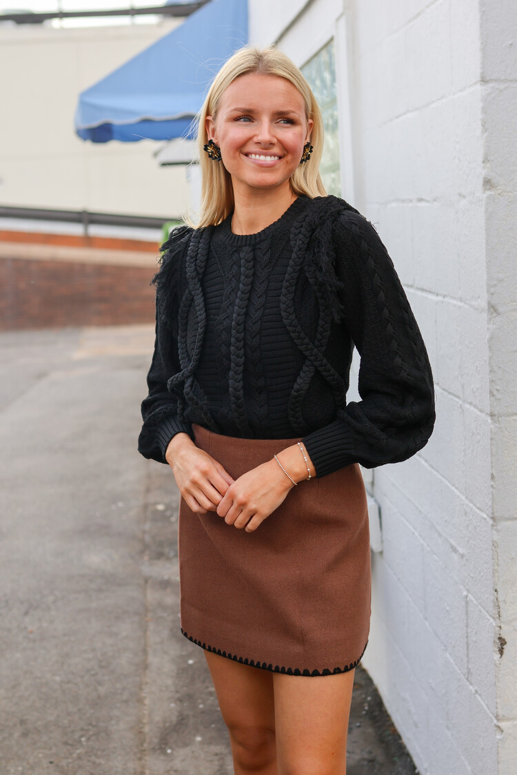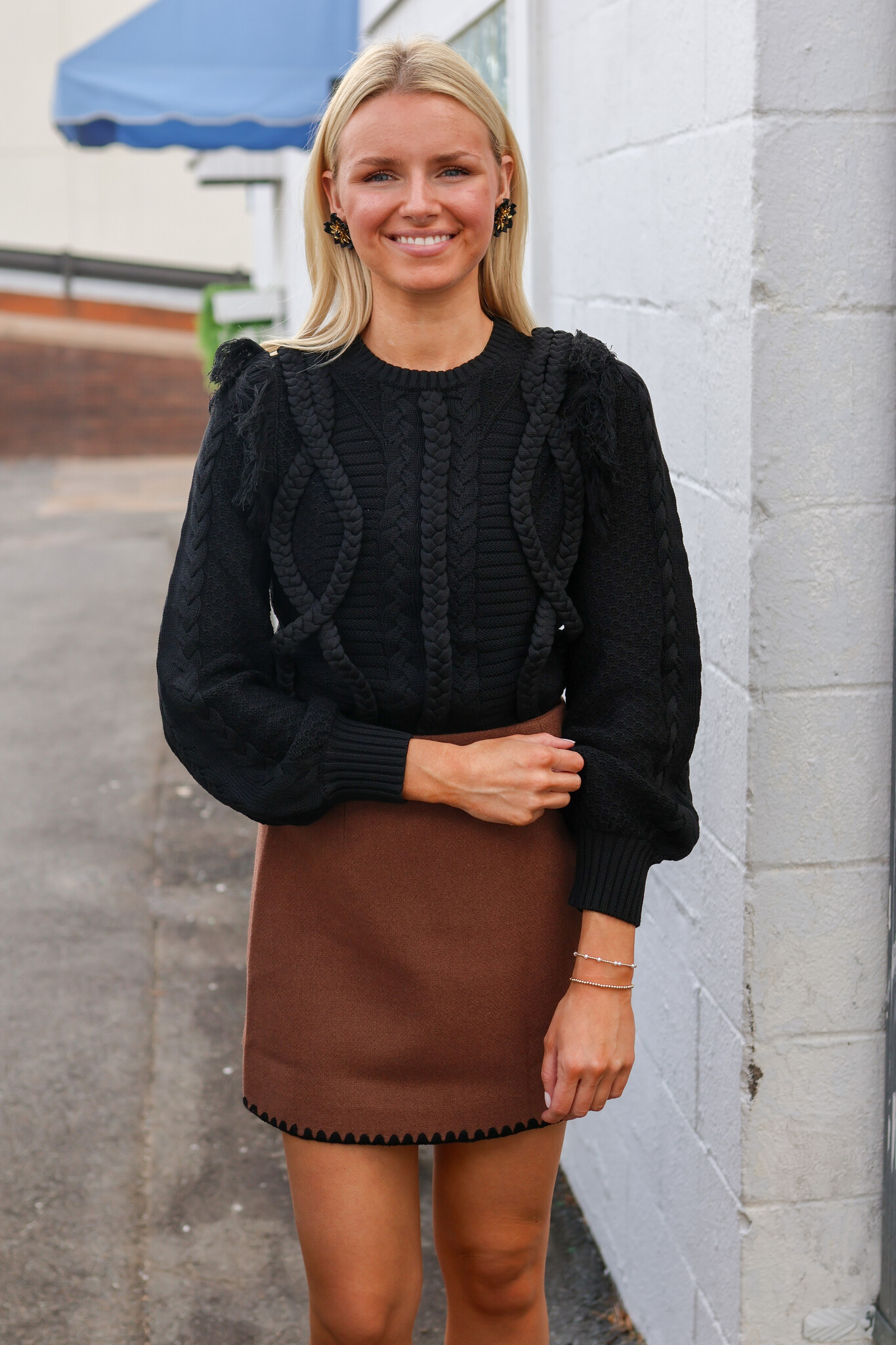It features a relaxed silhouette with blouson sleeves, offering comfort and style. Fringe at the shoulders adds a playful touch, while braided detailing along the body and sleeves brings rich texture and visual interest to this fun, cold-weather essential