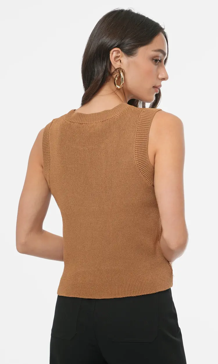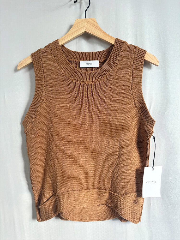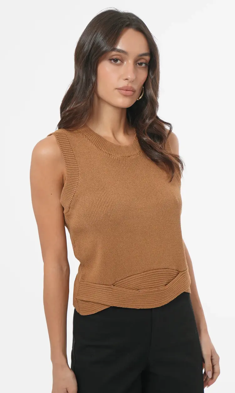 • Crafted in a rich caramel knit, this top features a modern crew neckline and a subtle twist hem that adds unexpected structure. Clean lines and a tailored fit keep it polished, while the cropped length pairs perfectly with high-waisted trousers or denim.