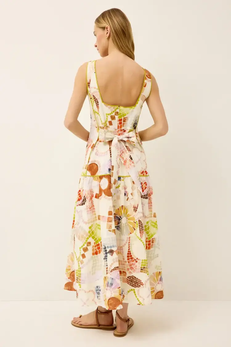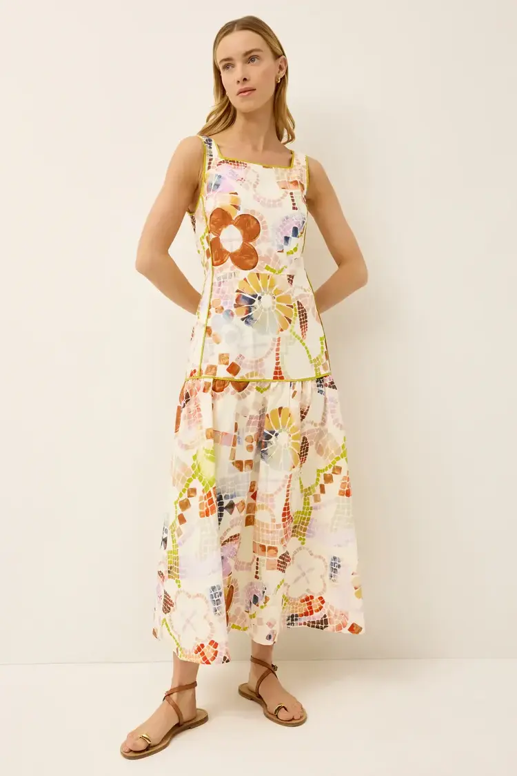With its watercolor mosaic print and bright, layered palette, the Jada dress in Travertine delivers a soft statement. The drop waist silhouette offers a relaxed fit, while yellow piping and a back bow detail give the piece a refined, feminine edge.
