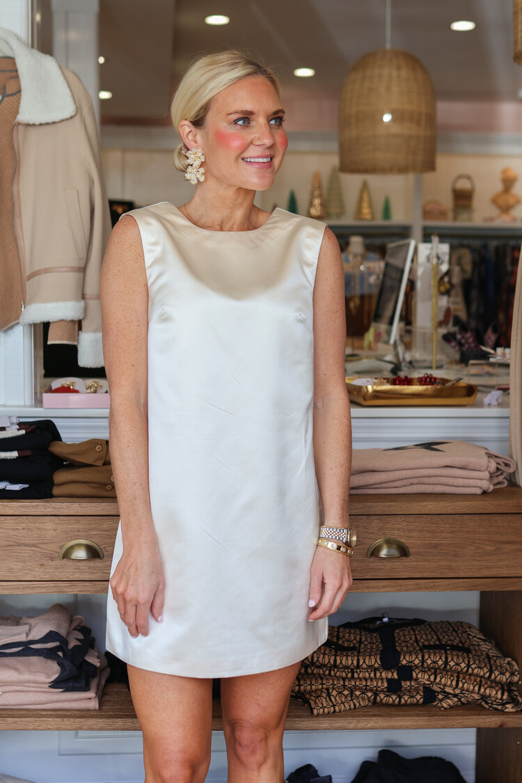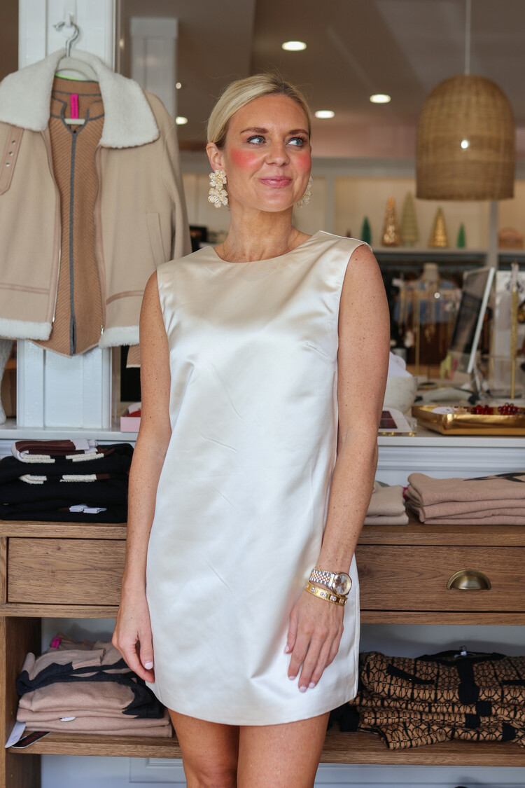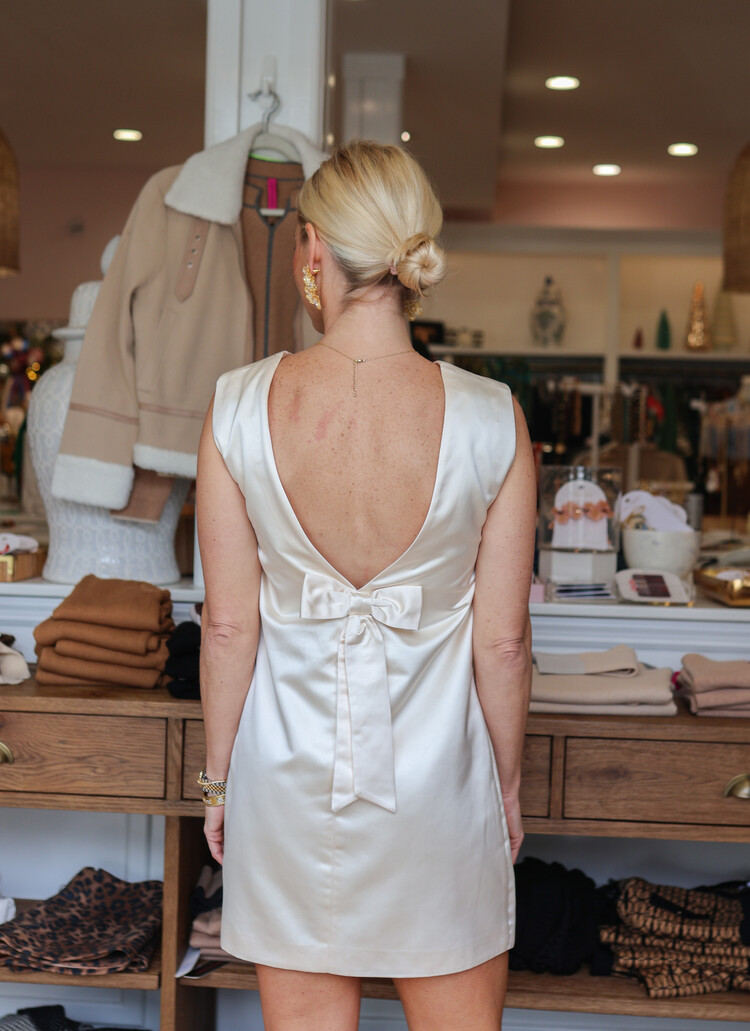 Simple in front, stunning from behind. The Jaxon Satin Bow Shift Dress turns heads with its fluid satin finish and dramatic back-tie detail. Designed in a relaxed shift silhouette, it drapes effortlessly and catches the light with every move.