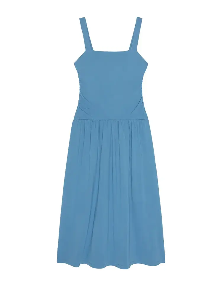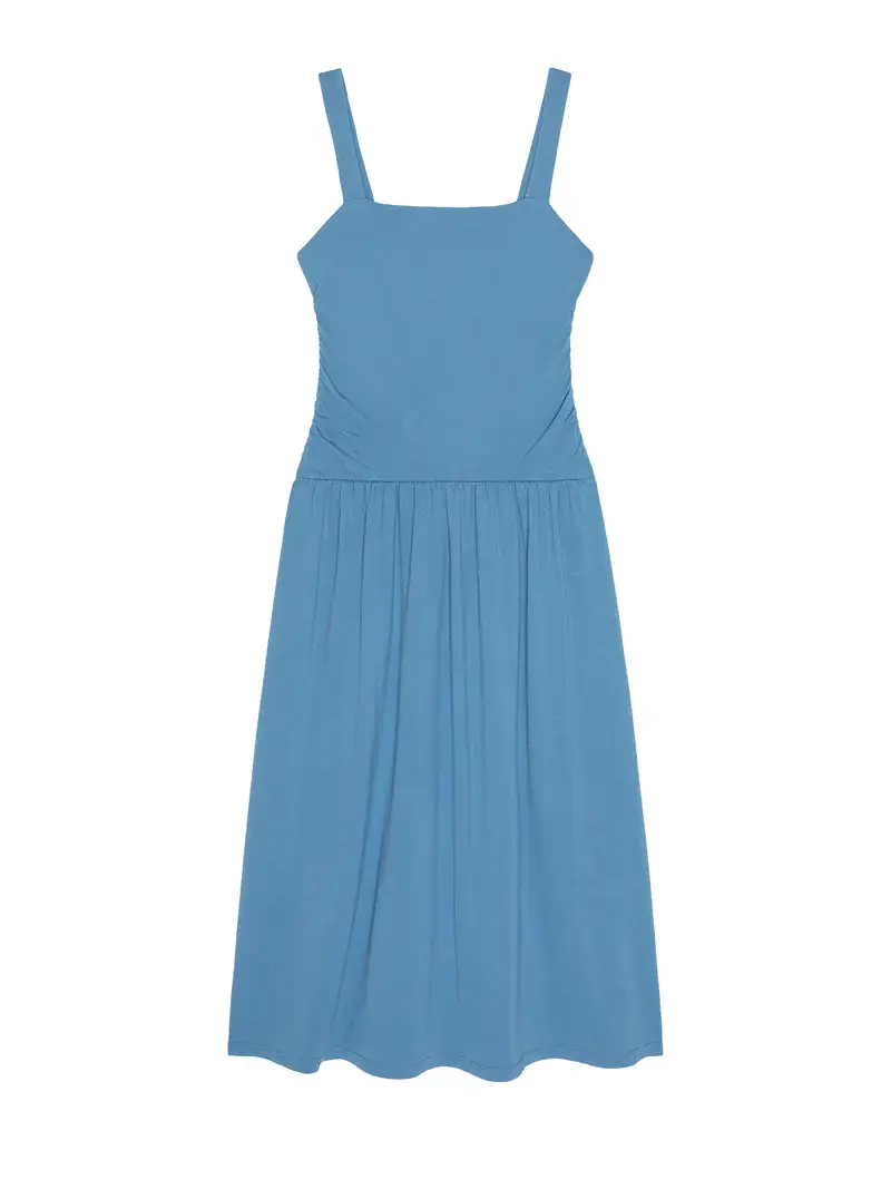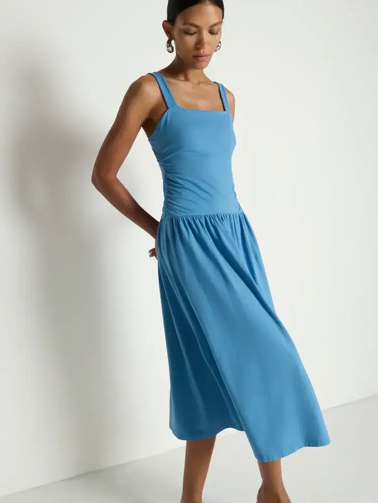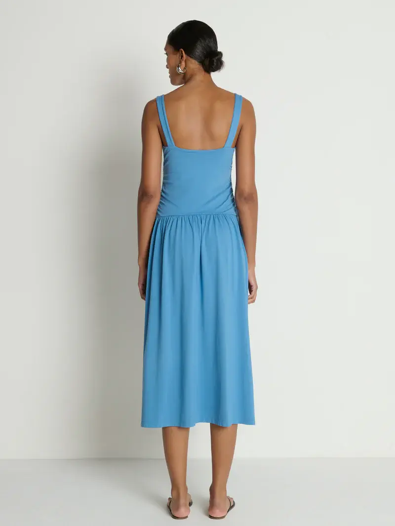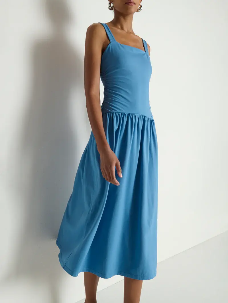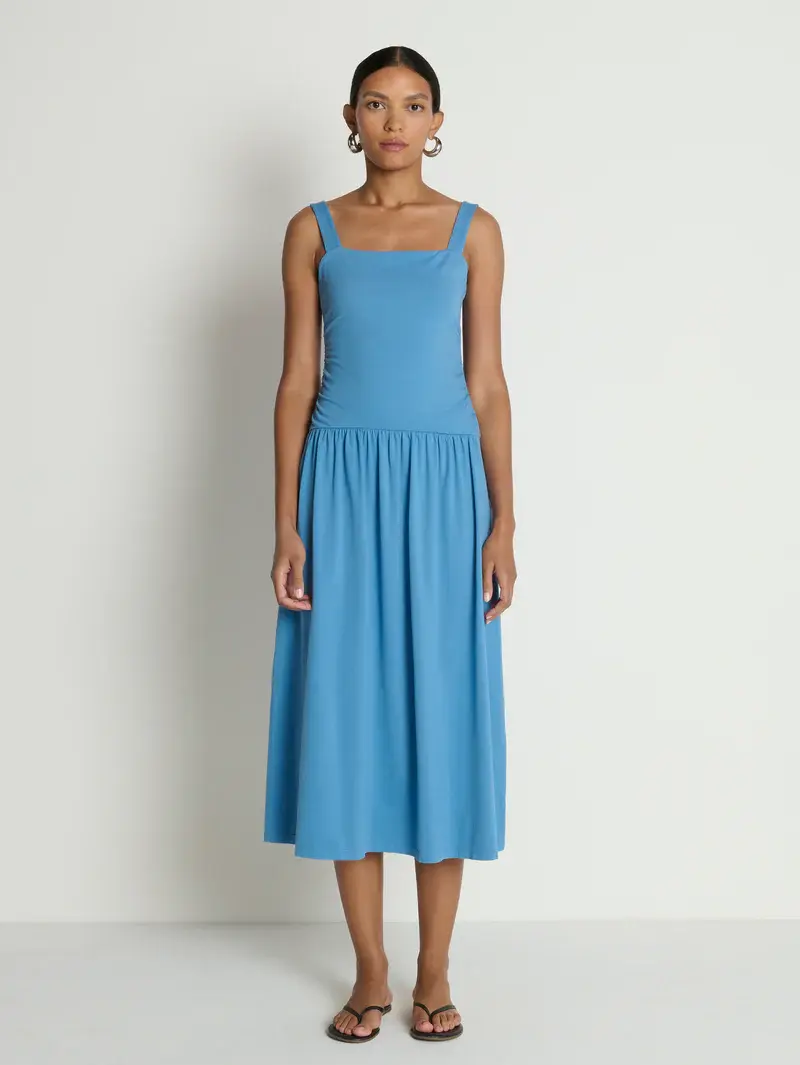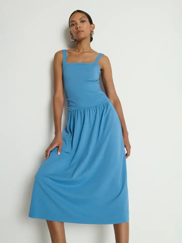 • Modern elegance. The Jennie Midi Dress is fitted through the bodice and flows into a relaxed skirt with a drop-waist seam and a clean square neckline.. Made from a butter soft Pima cotton jersey, it’s polished and endlessly versatile.
